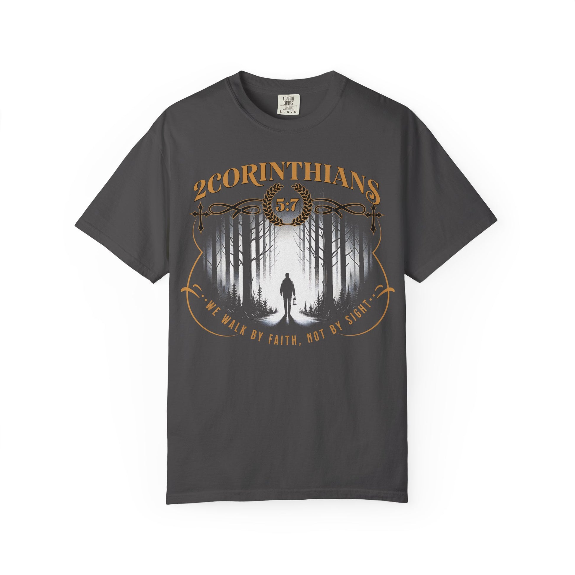 A lone figure walks a forest path bathed in divine light, framed by towering trees and scripture. The verse “2 Corinthians 5:7” anchors the design, proclaiming “We walk by faith, not by sight.” This graphic evokes spiritual courage, reminding believers to trust God’s guidance even when the way forward is unclear.