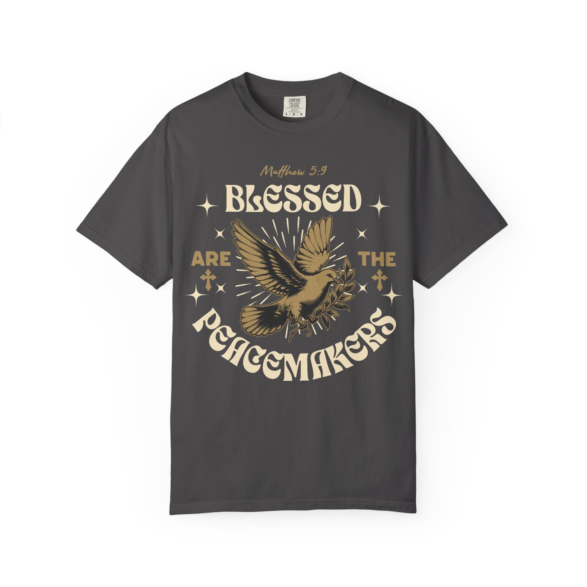 This garment-dyed tee carries a quiet, soulful energy — a vintage-inspired navy tee printed with a golden dove and the phrase “Blessed are the Peacemakers.” It wears soft from the first pull-on, the post-dye finish giving the color a lived-in depth that feels personal, not printed. The relaxed cut drapes easily over everyday life: worn under a flannel at volunteer nights, layered with a denim jacket for city service events, or simply paired with jeans while you head out to a community meeting. The dove and rays feel hopeful without shouting, a subtle way to show faith and calm conviction. Comfort Colors’ textured dye and tubular knit keep the silhouette clean and simple, so the message remains the focus.