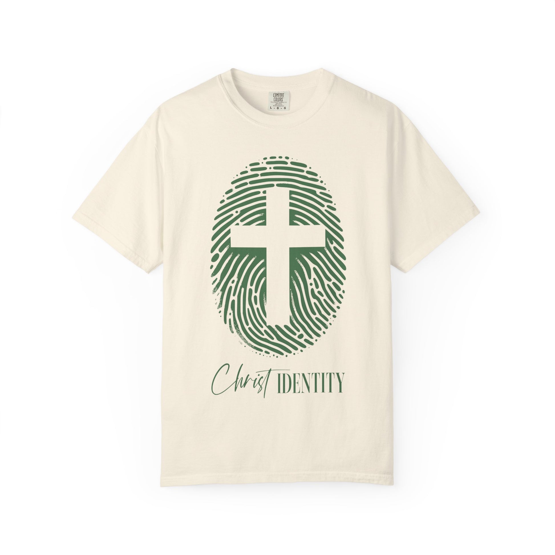 Soft, garment-dyed tee printed with a quiet, faith-forward design. The front features a fingerprint-shaped oval with a cross at its center and the words “Christ Identity” beneath—an intentional nod to belonging and spiritual roots. The fabric feels lived-in from the first wear thanks to the post-construction dyeing process, and the relaxed cut drapes easily over layers or stands on its own for everyday wear. Subtle, neutral tones let the design speak without shouting, making this shirt comfortable for church gatherings, mission trips, small group nights, or slow Sunday mornings.