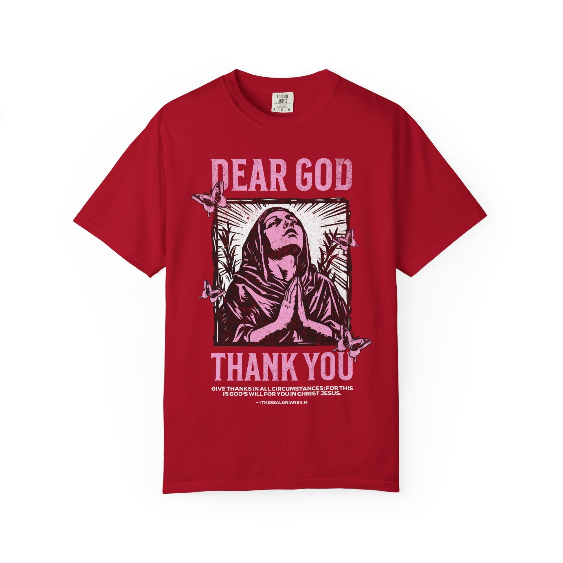 This uplifting design features a praying figure surrounded by butterflies and radiant light, framed by the bold phrases “Dear God” and “Thank You.” The scripture from 1 Thessalonians 5:18 reinforces the message of gratitude in all circumstances. The composition blends serenity and spiritual strength, making it a heartfelt expression of faith and thankfulness. Ideal for believers who want to wear their praise and appreciation with bold simplicity.