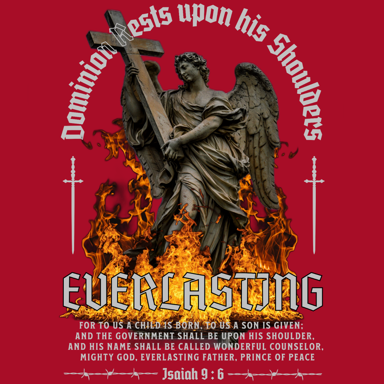 This dramatic design features an angel clutching a cross, engulfed in rising flames with the bold word “Everlasting” blazing below. Gothic text declares “Dominion rests upon his shoulders,” while Isaiah 9:6 anchors the message of divine authority and eternal kingship. The celestial and fiery elements combine to create a powerful visual of Christ’s sovereignty and the promise of peace. A bold statement for believers who honor the everlasting reign of Jesus.