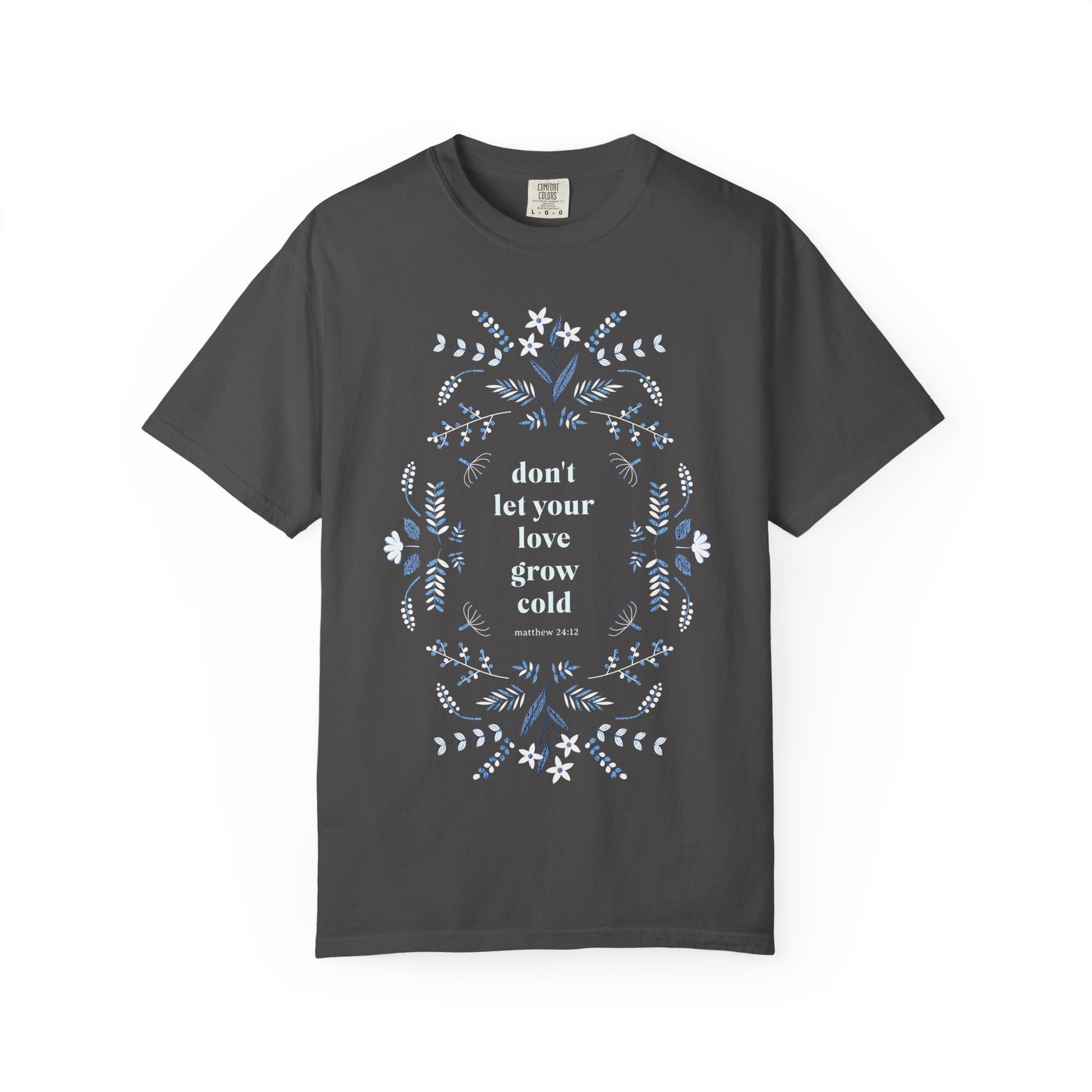 This design features a symmetrical floral arrangement of blue and white flowers framing a central quote: "don't let your love grow cold matthew 24:12." The elegant typography and botanical elements create a contemplative and emotionally resonant visual. The verse from Matthew emphasizes spiritual vigilance and enduring love, making the graphic a gentle yet powerful reminder of Christian faith and devotion.
