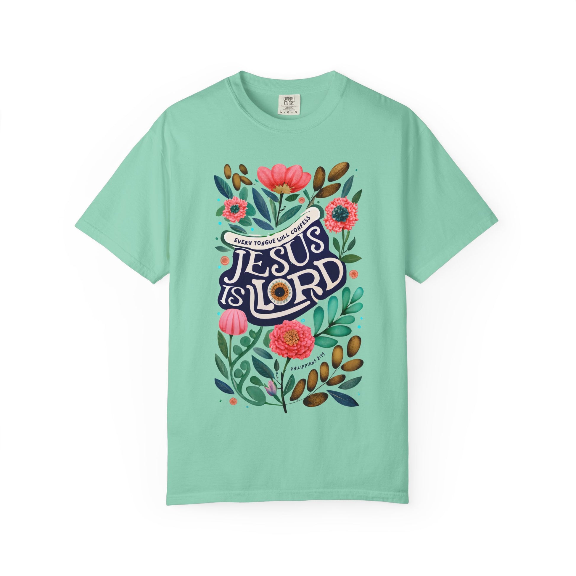 Soft, garment-dyed cotton meets hand-painted faith. This relaxed tee wears in like an old favorite — gentle color, soft-to-the-touch fabric, and a bold floral illustration that reads “Jesus is Lord.” The artwork blends vintage lettering with lush blooms and leafy vines, creating a quiet, hopeful statement that sits naturally in everyday life: church mornings, coffee with friends, or casual volunteer days. Lightweight yet substantial, it layers easily under jackets or stands alone as a simple declaration of belief wrapped in artisan charm.