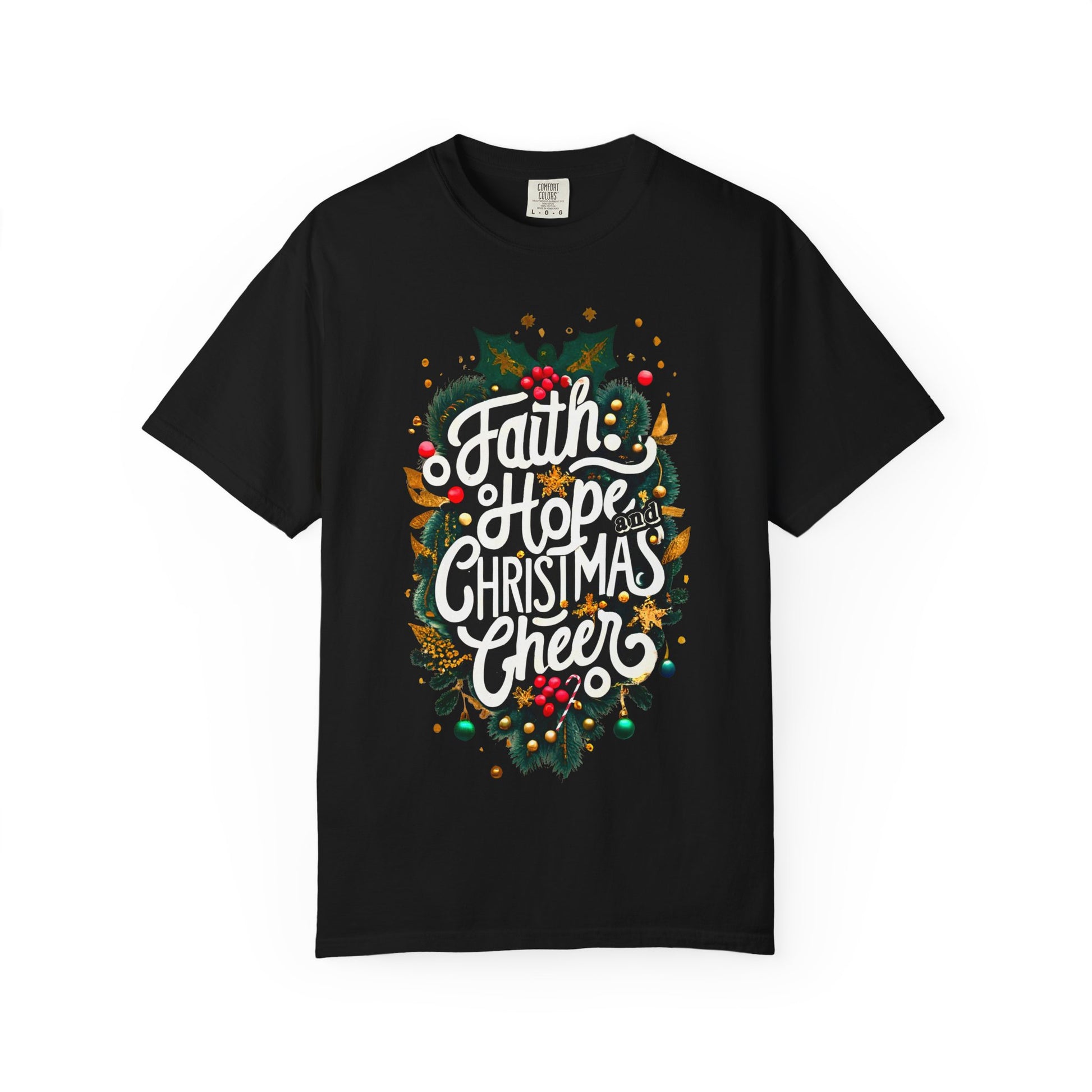 This festive design proclaims “Faith, Hope and Christmas Cheer” in decorative white script, surrounded by pine branches, holly, berries, gold leaves, and colorful ornaments. The vibrant details highlight the joy and warmth of the season while keeping the focus on faith and hope as central themes. Perfect for worship, family gatherings, or everyday wear, this shirt blends tradition and spirituality into a bold, conversation-starting graphic that celebrates the true meaning of Christmas.