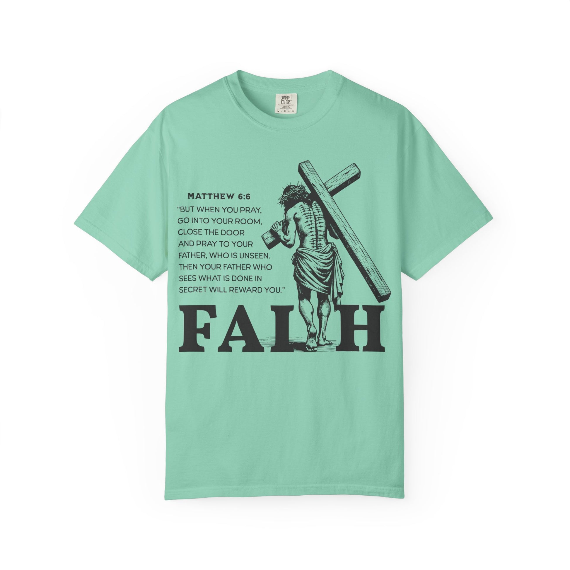 Christian t-shirt design featuring Jesus from behind, carrying a large wooden cross with visible crown of thorns and detailed musculature. The bold scripture from Matthew 6:6 emphasizes private prayer and divine reward. The word “FAITH” anchors the image, symbolizing strength through devotion. A powerful visual reminder of Christ’s sacrifice and the intimacy of spiritual connection.