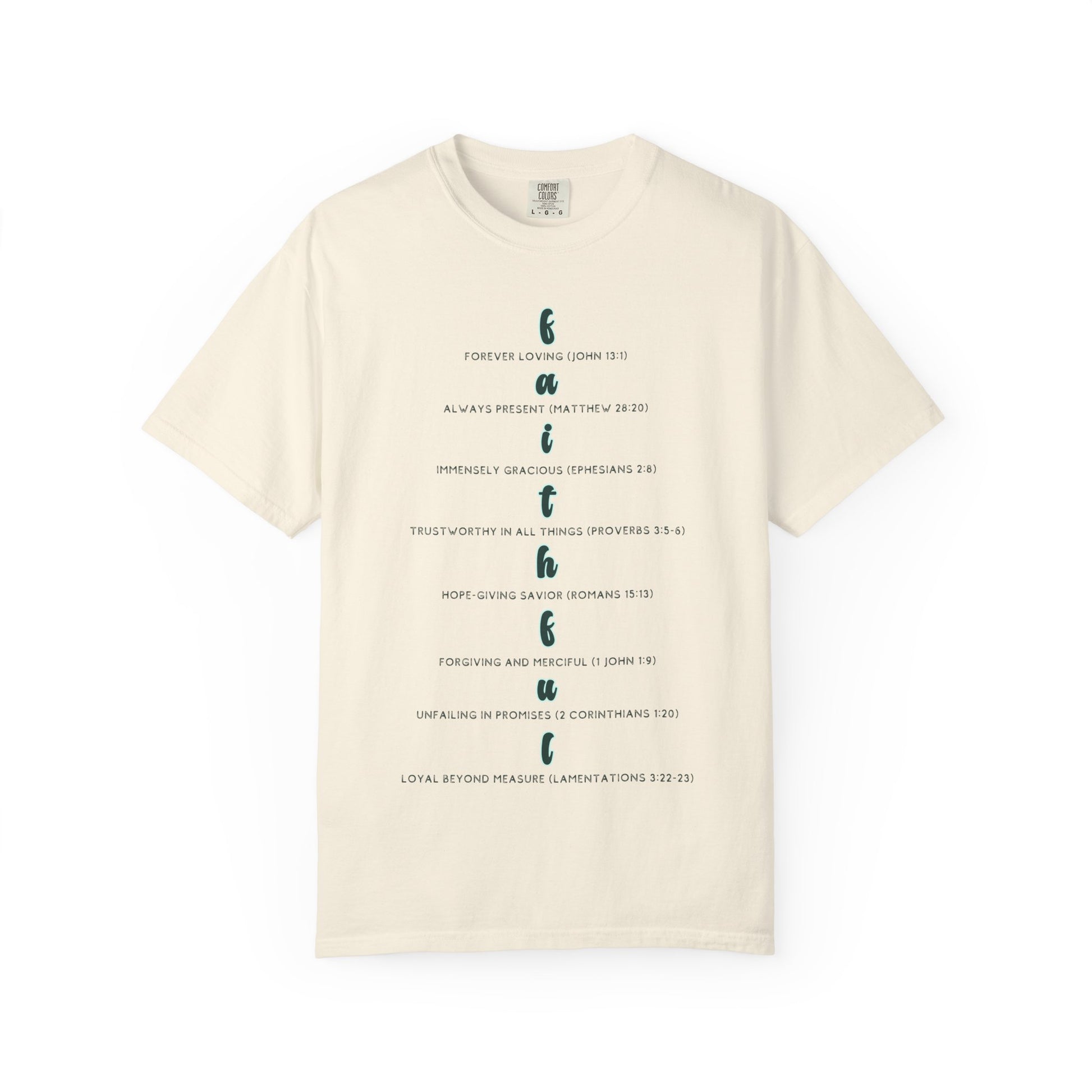This acrostic-style design spells out “FAITHFUL” vertically, with each letter paired to a powerful phrase and Bible verse. From “FOREVER LOVING” (John 13:1) to “LOYAL BEYOND MEASURE” (Lamentations 3:22-23), the graphic offers a full spectrum of divine attributes. It’s a scripture-rich tribute to God’s unwavering character—ideal for believers who want to wear encouragement, truth, and spiritual depth.