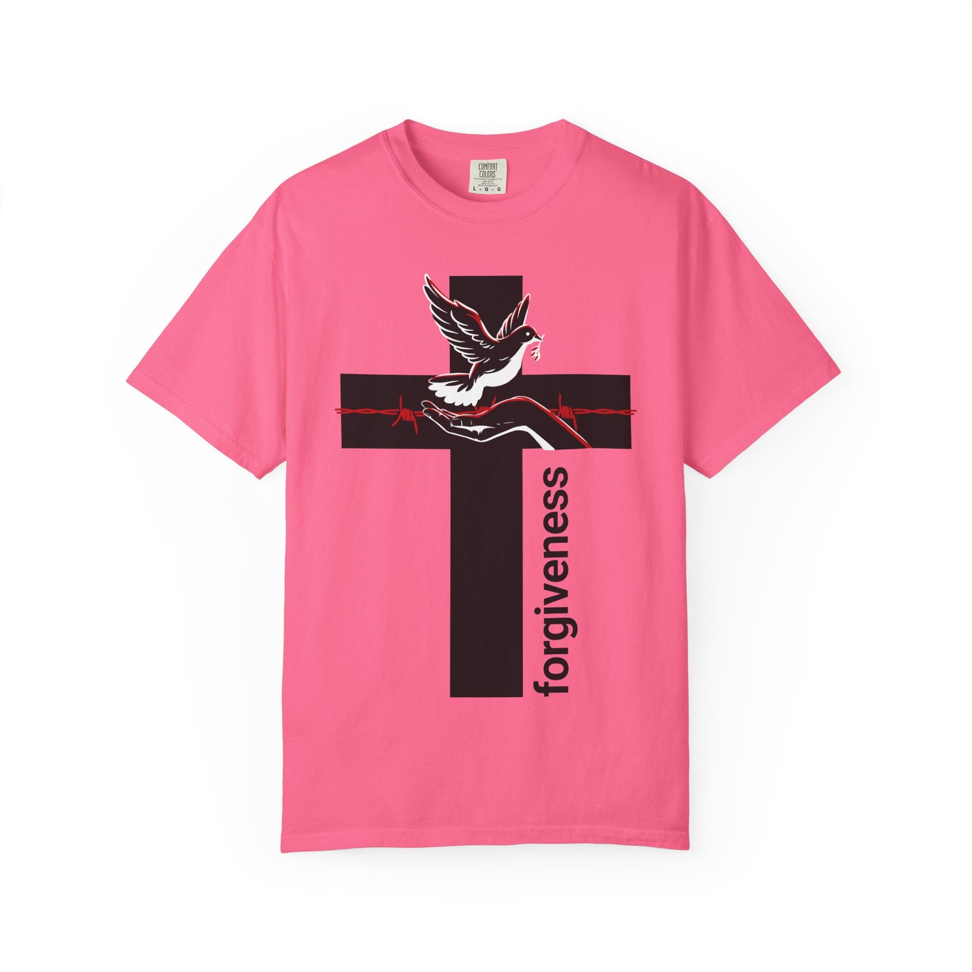 This soft garment-dyed tee carries a quiet, spiritual statement — a broad black cross, a red-stitched thread running across it like a healed wound, and a dove lifting away toward light. The vertical word “forgiveness” reads like a gentle reminder, not a slogan. Worn alone or layered under a jacket, the relaxed fit and medium-weight cotton settle against the skin with lived-in comfort. It’s for people who value meaning in their daily wear: seekers, church groups, grief walkers, and anyone marking a season of letting go. The tonal dyeing and subtle texture make each shirt feel slightly unique, while durable double-needle seams and a tubular, seam-free body keep the silhouette clean. Choose it when you want clothing that speaks with humility — steady, thoughtful, and quietly hopeful.