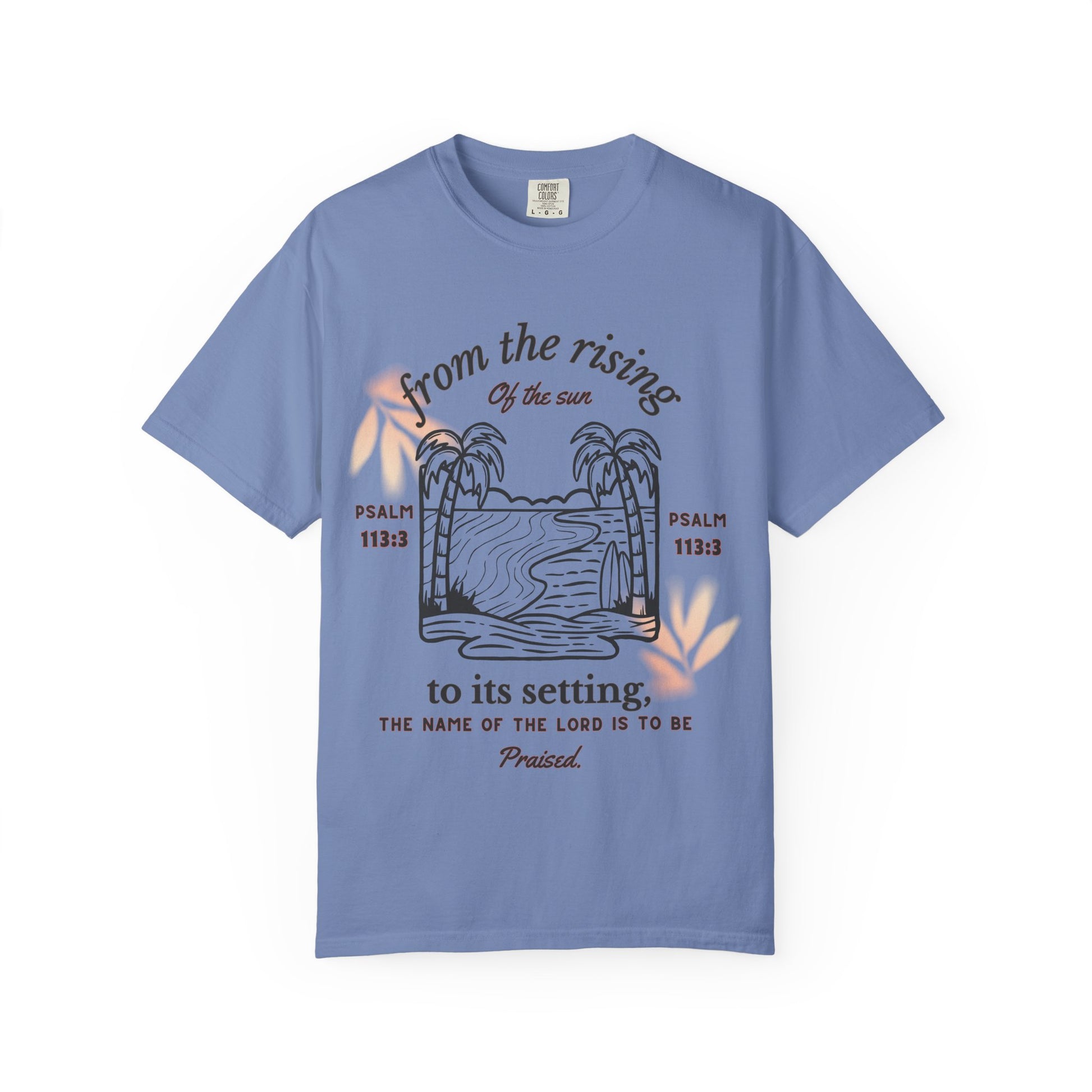 Soft, lived-in comfort meets quiet faith. This garment-dyed tee carries a sunlit scene—palm silhouettes framing a gentle shoreline—paired with the scripture line “From the rising of the sun to its setting” for a calm, reflective look. The relaxed fit and medium-weight cotton drape easily over jeans or shorts. Wear it when you want a simple reminder of grace during beach walks, Sunday meetups, or slow mornings with coffee. The muted, vintage-toned dye and sewn-in label make it feel like a favorite right away.