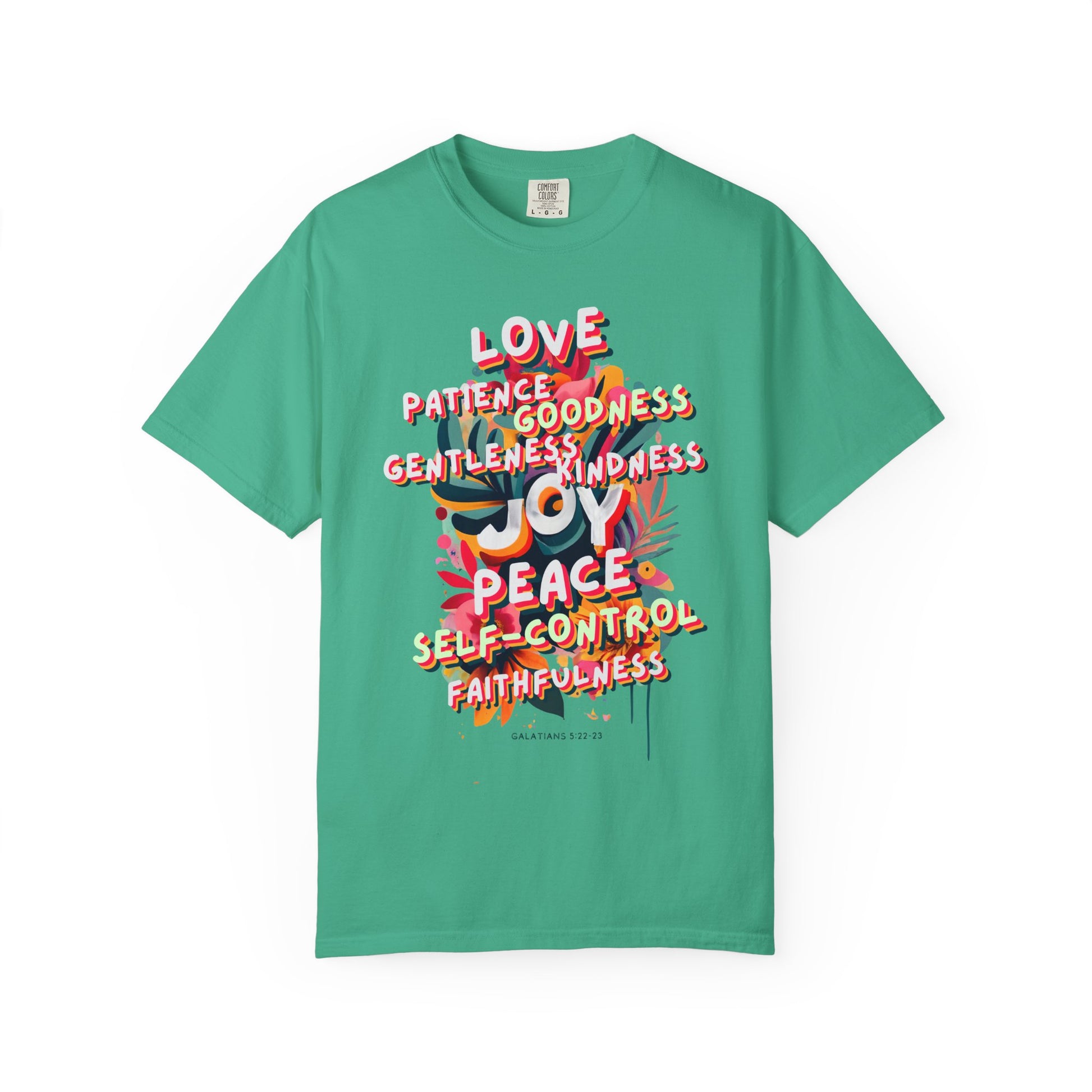 This relaxed-fit tee is a soft, garment-dyed cotton shirt that wears in like an old favorite. Bright, layered lettering and abstract shapes form a joyful graphic across the chest — words like Love, Joy, Peace, and Kindness rise in warm, hand-drawn type that feels optimistic without being preachy. The medium-weight fabric and tubular knit create a smooth silhouette that keeps its color and cozy hand after multiple washes. Wear it for casual mornings, volunteer days, community meetups, or when you want to carry a subtle message of calm and connection with you.