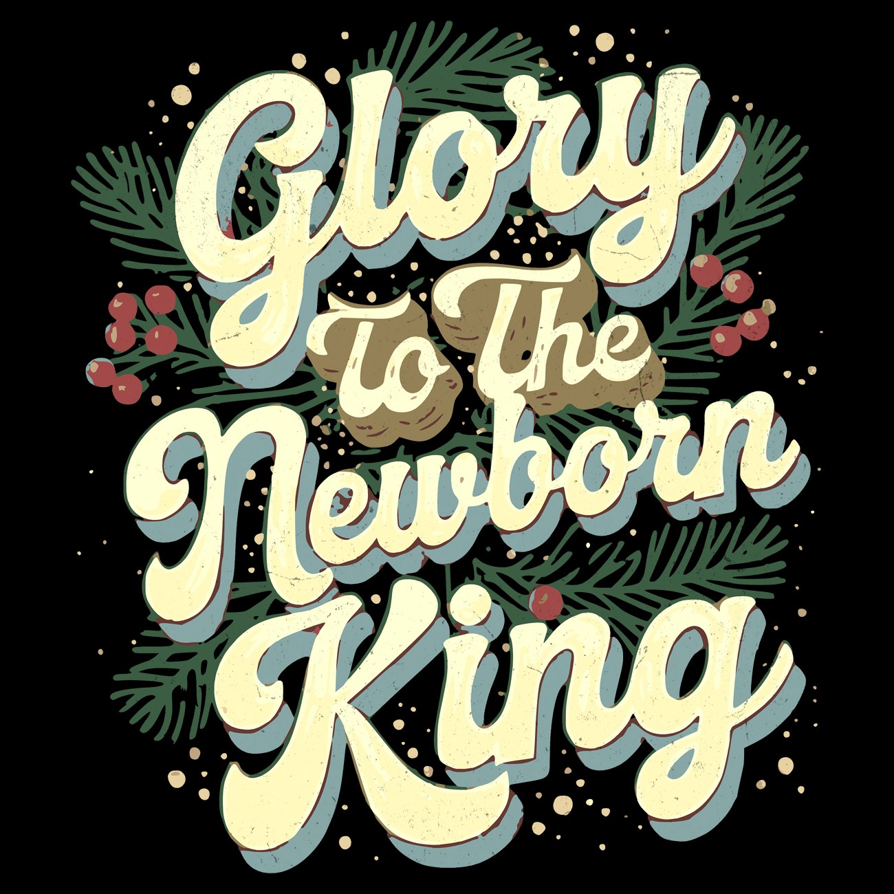 Celebrate the birth of Christ with this festive design featuring the joyful phrase “Glory to the Newborn King.” Decorative script lettering shines with dimension, accented by pine branches, red berries, and golden bells. This artwork captures the spirit of Christmas, blending faith and tradition into a bold, conversation-starting graphic. Perfect for holiday gatherings, worship services, or everyday wear, it reminds all who see it of the true meaning of the season.