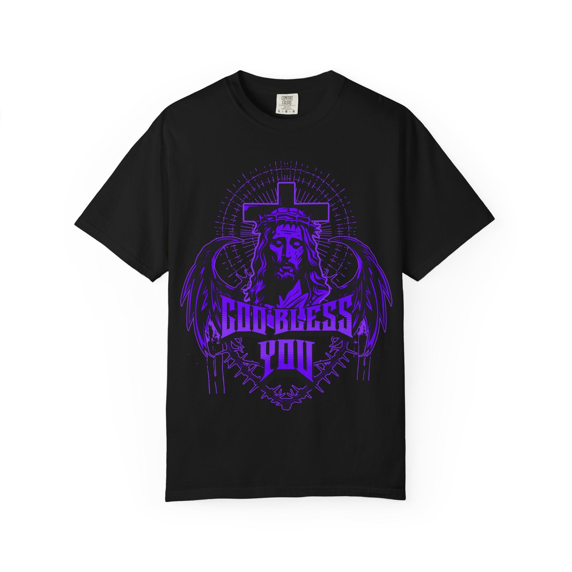 This dramatic Christian t-shirt design showcases a stylized image of Jesus Christ wearing a crown of thorns, flanked by detailed angel wings and backed by a bold cross. Radiant halo lines encircle His head, emphasizing divinity and reverence. Below the illustration, the phrase “GOD BLESS YOU” appears in gothic-style lettering, framed by barbed wire. The composition blends spiritual symbolism with a gritty, ornamental aesthetic that evokes strength and sacred protection.