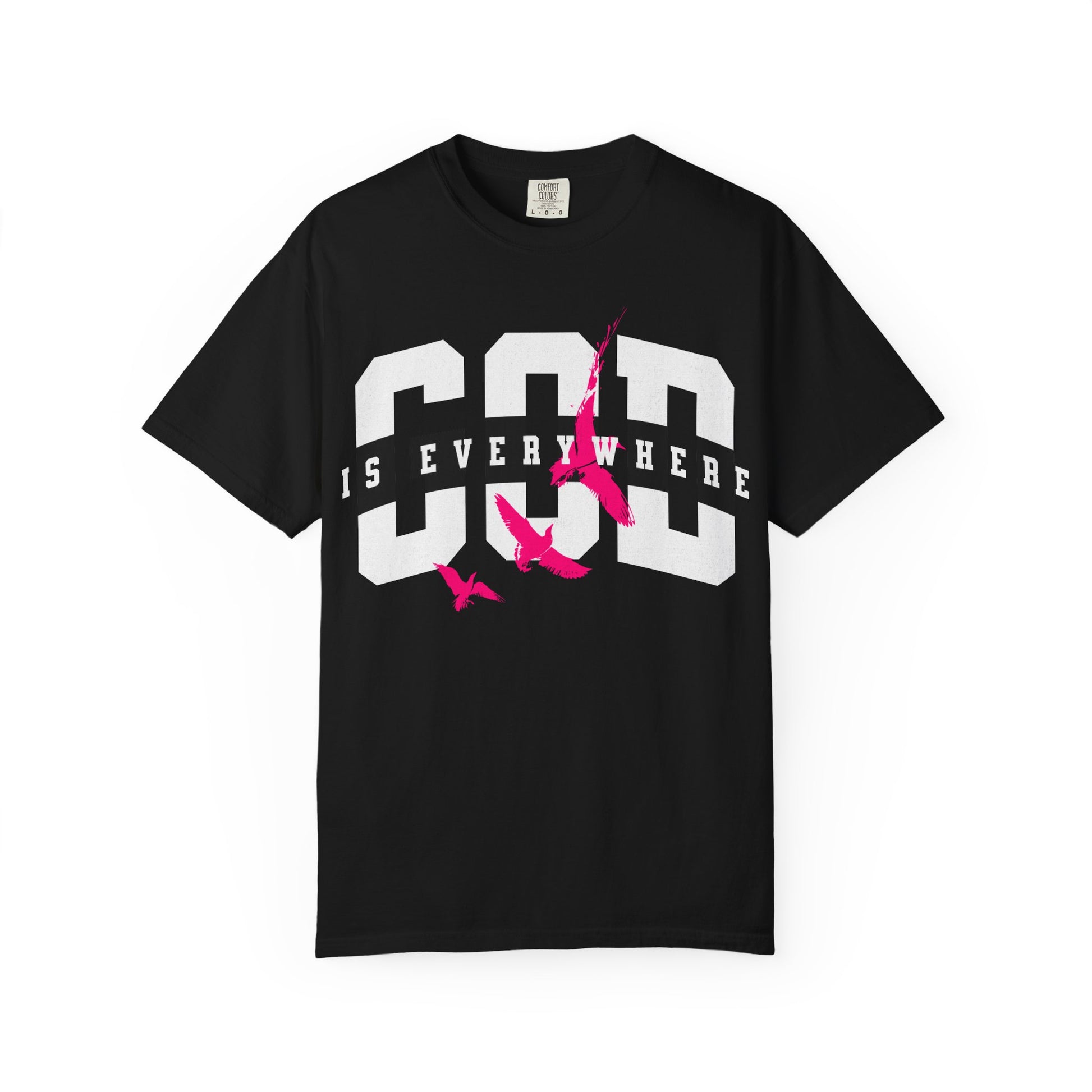 This bold Christian t-shirt design features the phrase “GOD IS EVERYWHERE” in large, distressed white block letters, with “IS EVERYWHERE” arched across the center. Three vibrant magenta doves soar across the composition, adding motion and spiritual symbolism. The layout is clean yet dynamic, with the birds’ flight paths suggesting divine presence in all directions. The contrast between the white text and pink birds creates a visually striking and faith-affirming design.