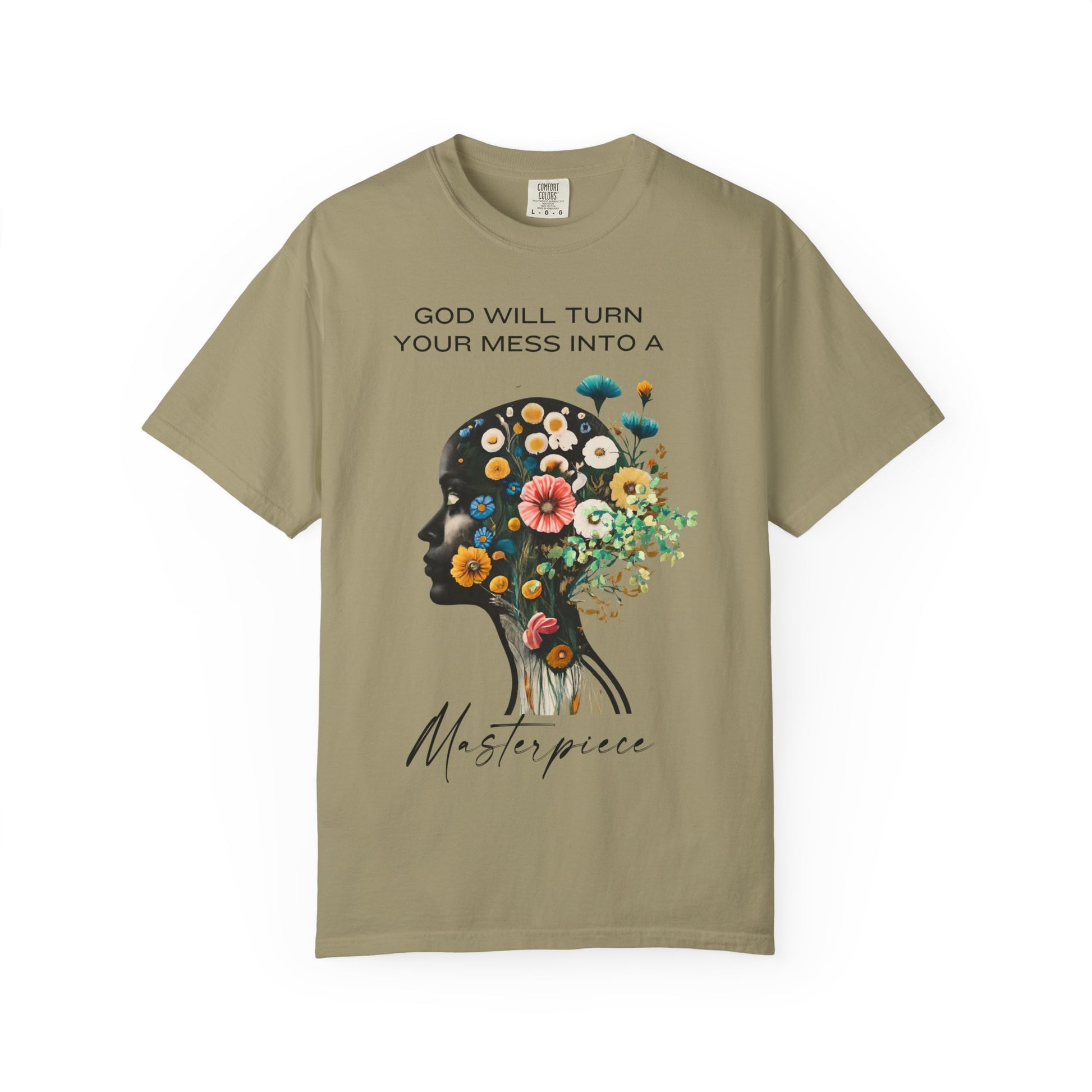 A side-profile silhouette bursts with colorful flowers and foliage, symbolizing transformation and renewal. Above it reads “God will turn your mess into a,” while the word “Masterpiece” anchors the bottom. This design blends artistic symbolism with spiritual encouragement, offering a bold reminder of divine restoration. Ideal for those who want to wear hope and beauty, it’s a visual testimony to God’s redemptive power.