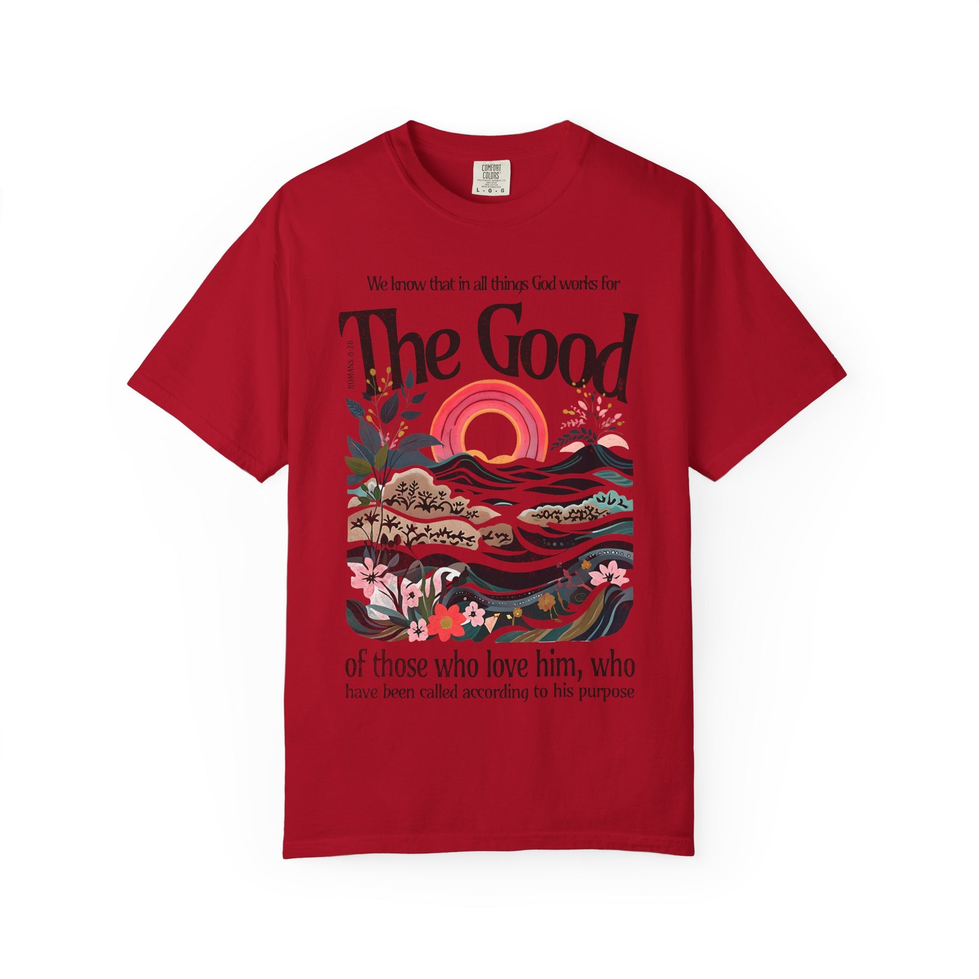 A radiant sun rises over stylized mountains and waves, surrounded by vibrant flowers and foliage. The phrase "We Know That In All Things God Works For The Good" is layered across the scene, with Romans 8:28 anchoring the message. The composition blends natural beauty with divine assurance, emphasizing purpose, love and spiritual calling. This design offers a bold visual of hope and trust in God's plan.