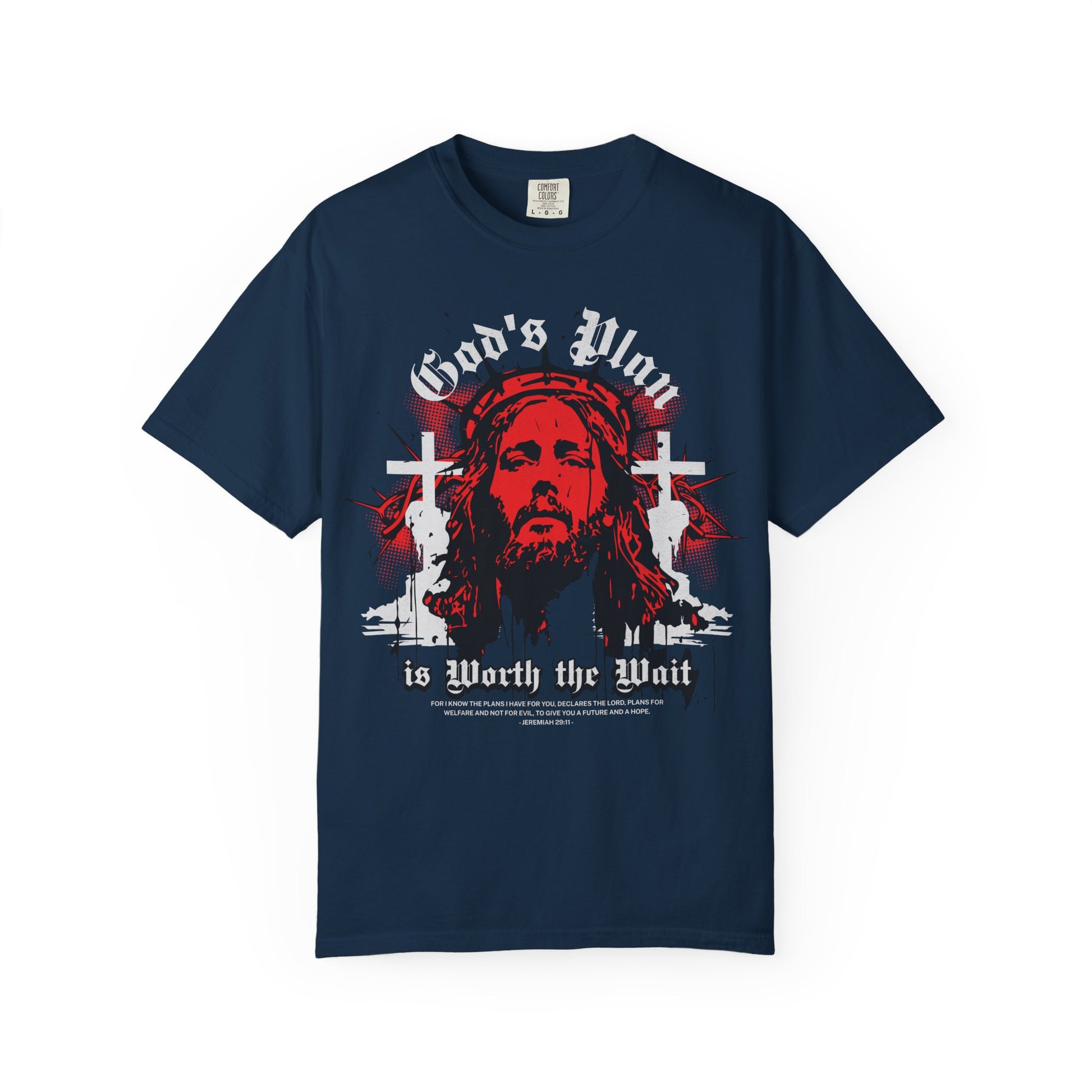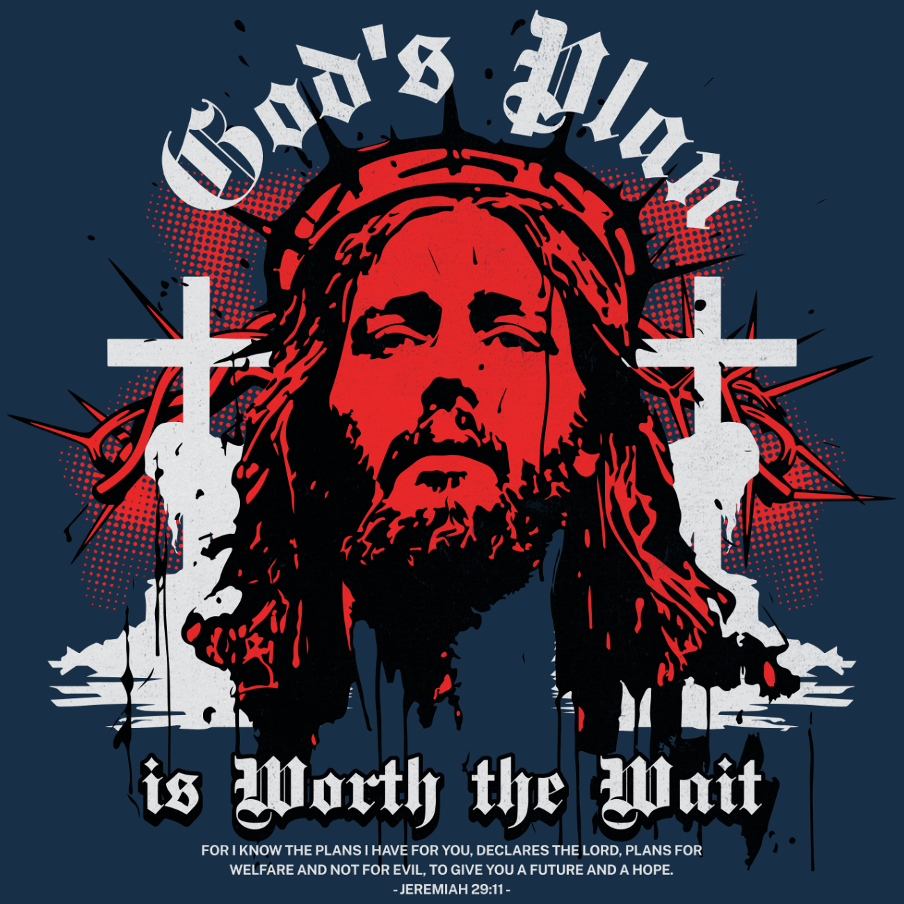 Bold and intense, this graphic features Jesus crowned with thorns, flanked by two crucified figures on white crosses. Gothic text declares “God’s Plan is Worth the Wait,” anchored by Jeremiah 29:11, emphasizing divine purpose and hope. Red halftone and black splatter effects amplify the drama, making this design a powerful statement of faith, patience, and spiritual endurance. Ideal for believers who trust in God's timing.