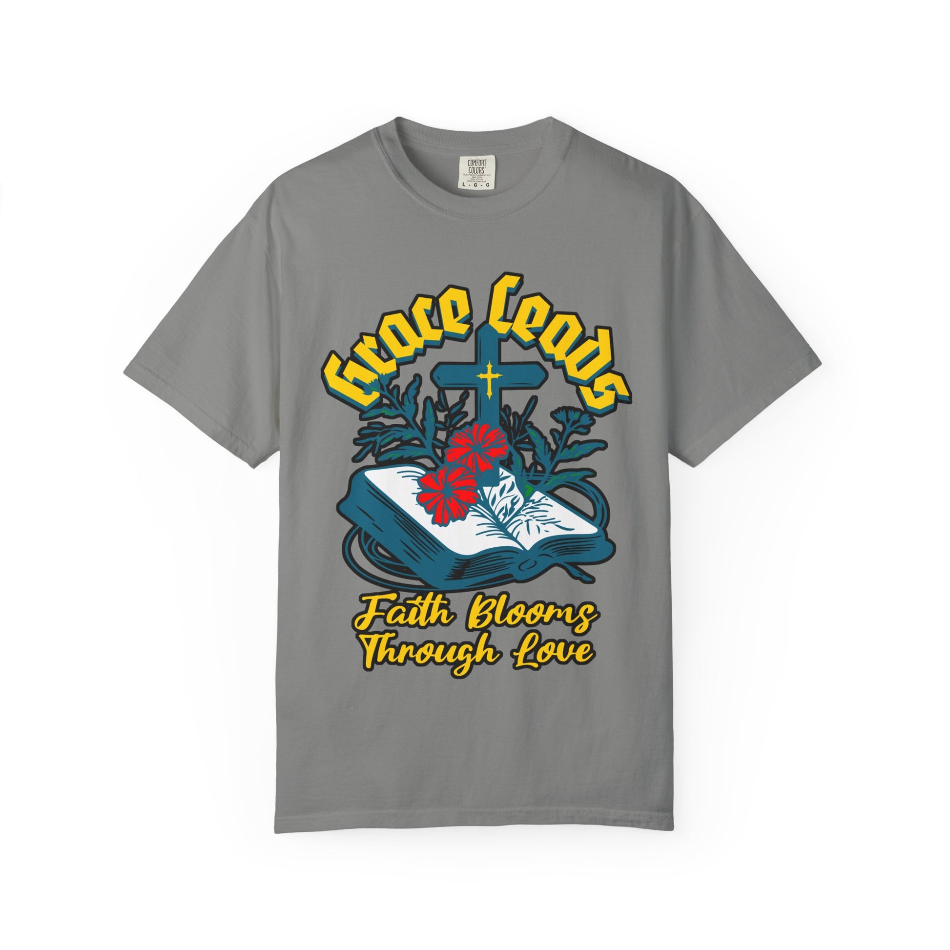 This vibrant illustration centers on a blue cross with a radiant yellow star, surrounded by flourishing red flowers and leafy greenery. Beneath the cross lies an open book, symbolizing scripture, with floral accents flowing from its pages. The bold phrase “Grace Leads” crowns the design, while “Faith Blooms Through Love” anchors it in elegant cursive. The composition celebrates spiritual growth, divine guidance, and the blossoming of faith through love.