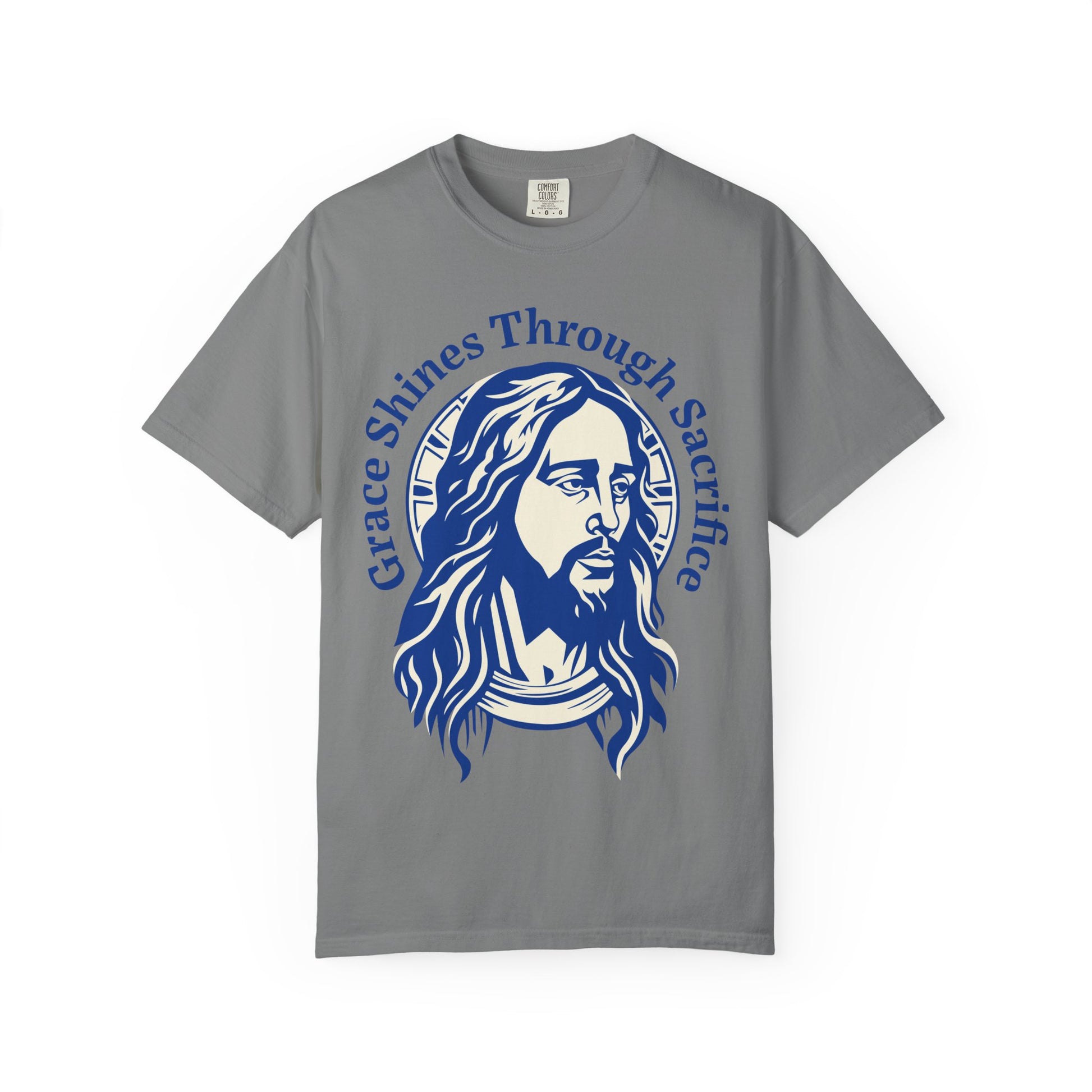 A stylized depiction of Jesus Christ rendered in bold blue tones, surrounded by the phrase “Grace Shines Through Sacrifice.” His expression is solemn yet radiant, embodying divine strength and mercy. The curved typography frames the figure with reverence, emphasizing the spiritual message of redemption through suffering. This design evokes deep reflection and celebrates the transformative power of grace in the face of sacrifice.
