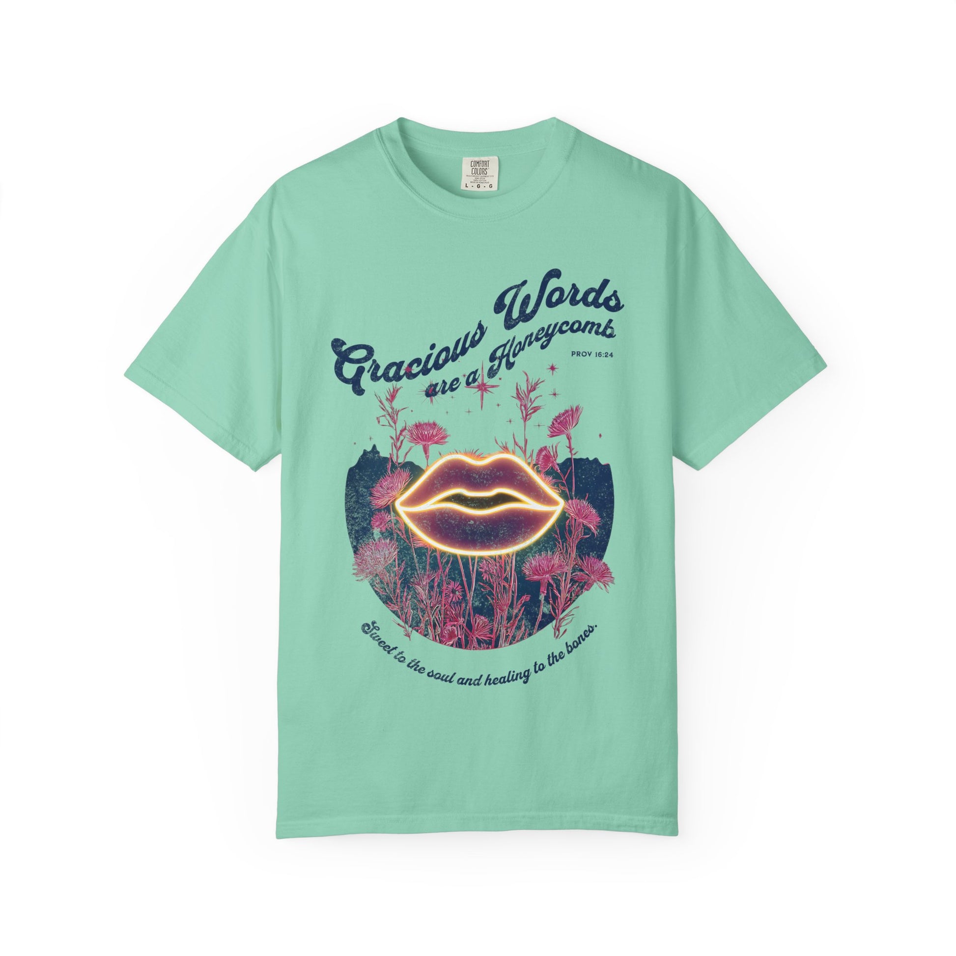 This Christian t-shirt graphic features neon-glowing lips surrounded by pink thistle-like flowers, set against a dark mountainous silhouette. The phrase "Gracious Words are a Honeycomb" appears in decorative script, with "PROV 16:24" referencing Proverbs 16:24. Below, the verse continues: "Sweet to the soul and healing to the bones." The design blends vibrant color with spiritual depth, emphasizing the healing power of kind and gracious speech.