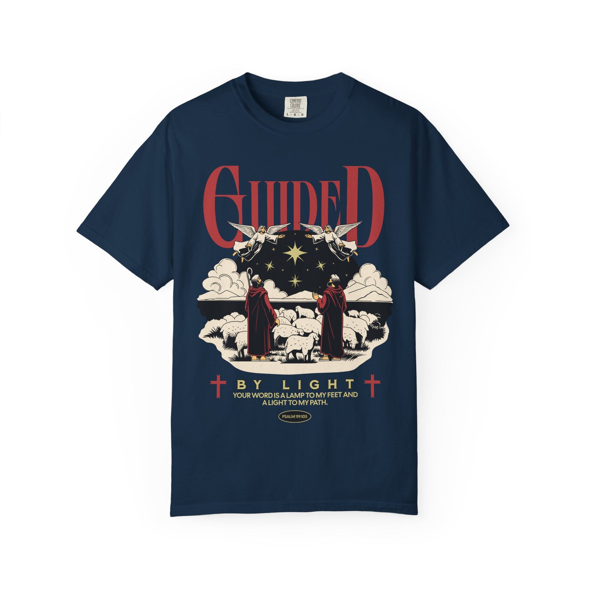This Christian t-shirt graphic features the bold word "GUIDED" above a celestial scene with two angels flying and pointing trumpets toward a radiant star. Beneath them, two robed figures stand among sheep, gazing upward. The verse "Your word is a lamp to my feet and a light to my path" from Psalm 119:105 anchors the design, emphasizing divine guidance and spiritual illumination through faith and scripture.