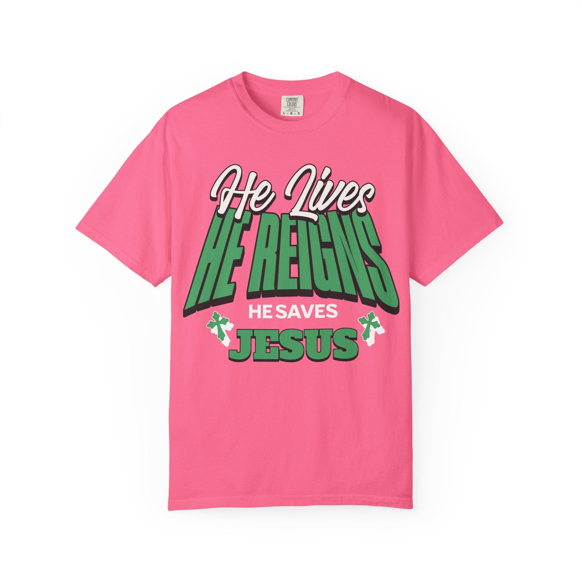 Vibrant Christian t-shirt design featuring bold declarations: “He Lives,” “He Reigns,” “He Saves,” and “Jesus,” set against a pink background. Green crosses with pink ribbons flank the name of Jesus, reinforcing themes of resurrection, sovereignty, and salvation. This eye-catching graphic celebrates Christ’s eternal power and grace, ideal for joyful witness and faith-forward fashion.