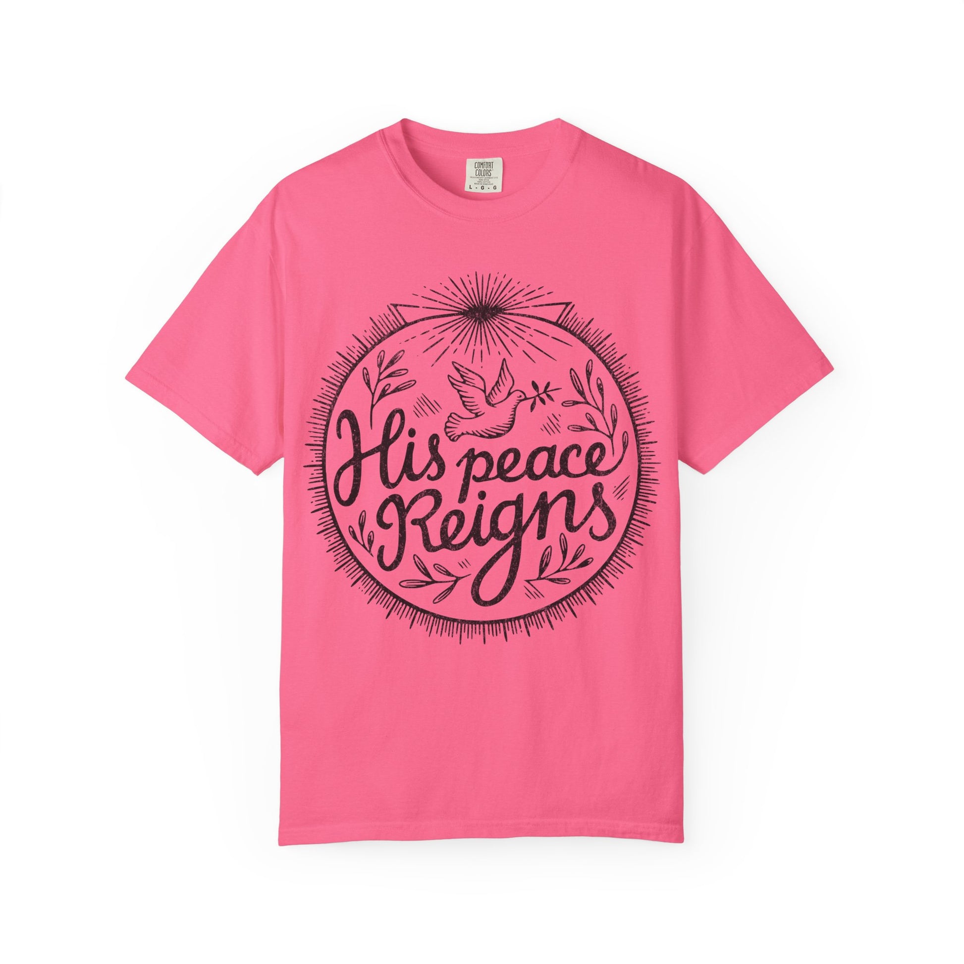 This circular design features a graceful dove carrying an olive branch, surrounded by leafy accents and radiating lines. The phrase “His peace Reigns” anchors the image in bold, flowing script. It’s a serene and spiritually uplifting graphic that speaks to divine calm and reassurance—ideal for those who want to wear a message of faith and tranquility with quiet strength.