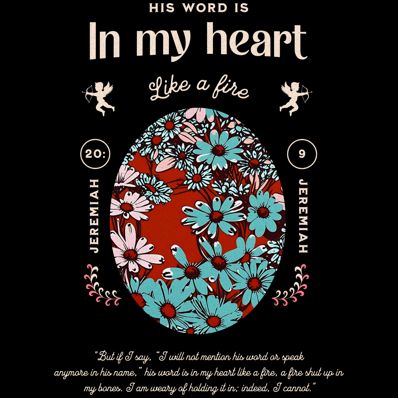 This passionate design features floral elegance framing the fiery declaration from Jeremiah 20:9: “His word is in my heart like a fire.” With trumpet-blowing angels and vintage typography, it captures the unstoppable power of divine inspiration. It’s a wearable blaze of conviction—perfect for believers who can’t help but speak truth, even when silence tempts.