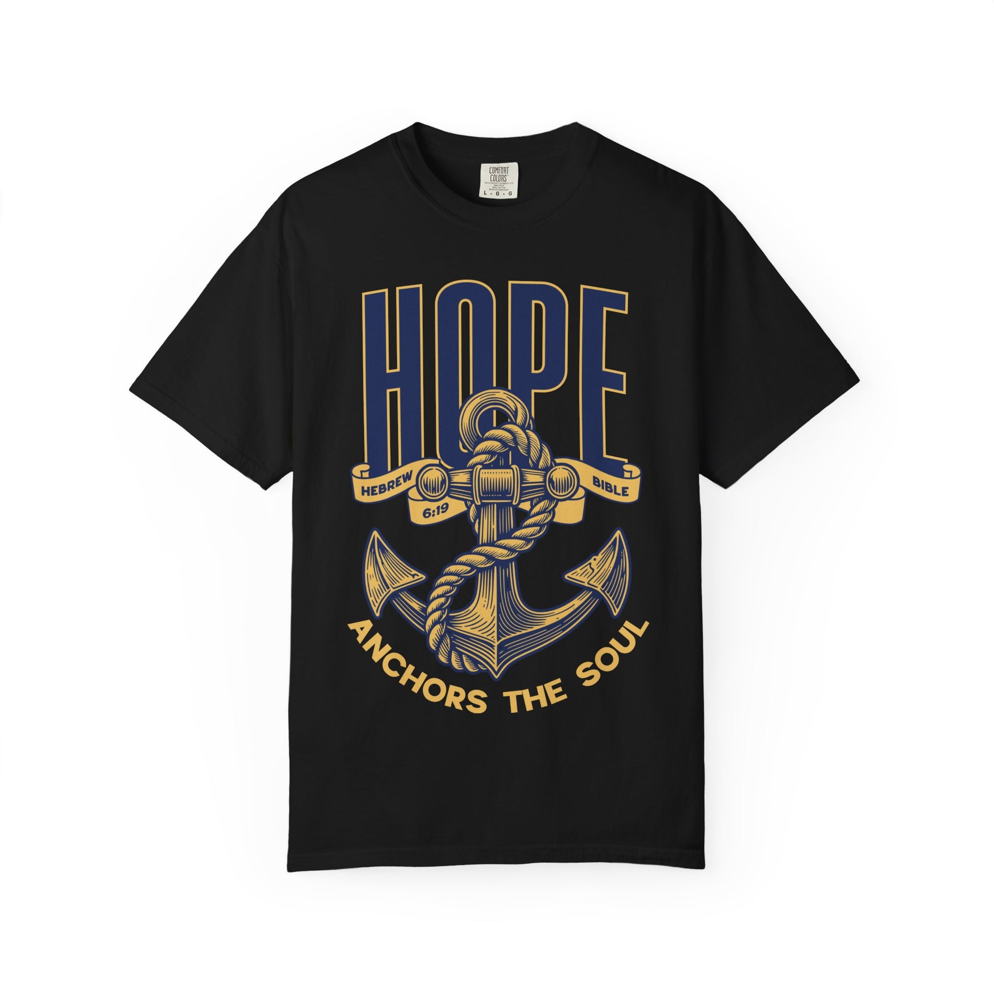 This graphic features a bold anchor wrapped in rope, symbolizing strength and stability. Above it, the word "HOPE" stands out prominently. A ribbon across the anchor reads "HEBREW BIBLE 6:19," referencing the verse about hope anchoring the soul. Below, the phrase "ANCHORS THE SOUL" reinforces the spiritual message. The design uses nautical symbolism to convey Christian faith, grounding, and resilience through hope.