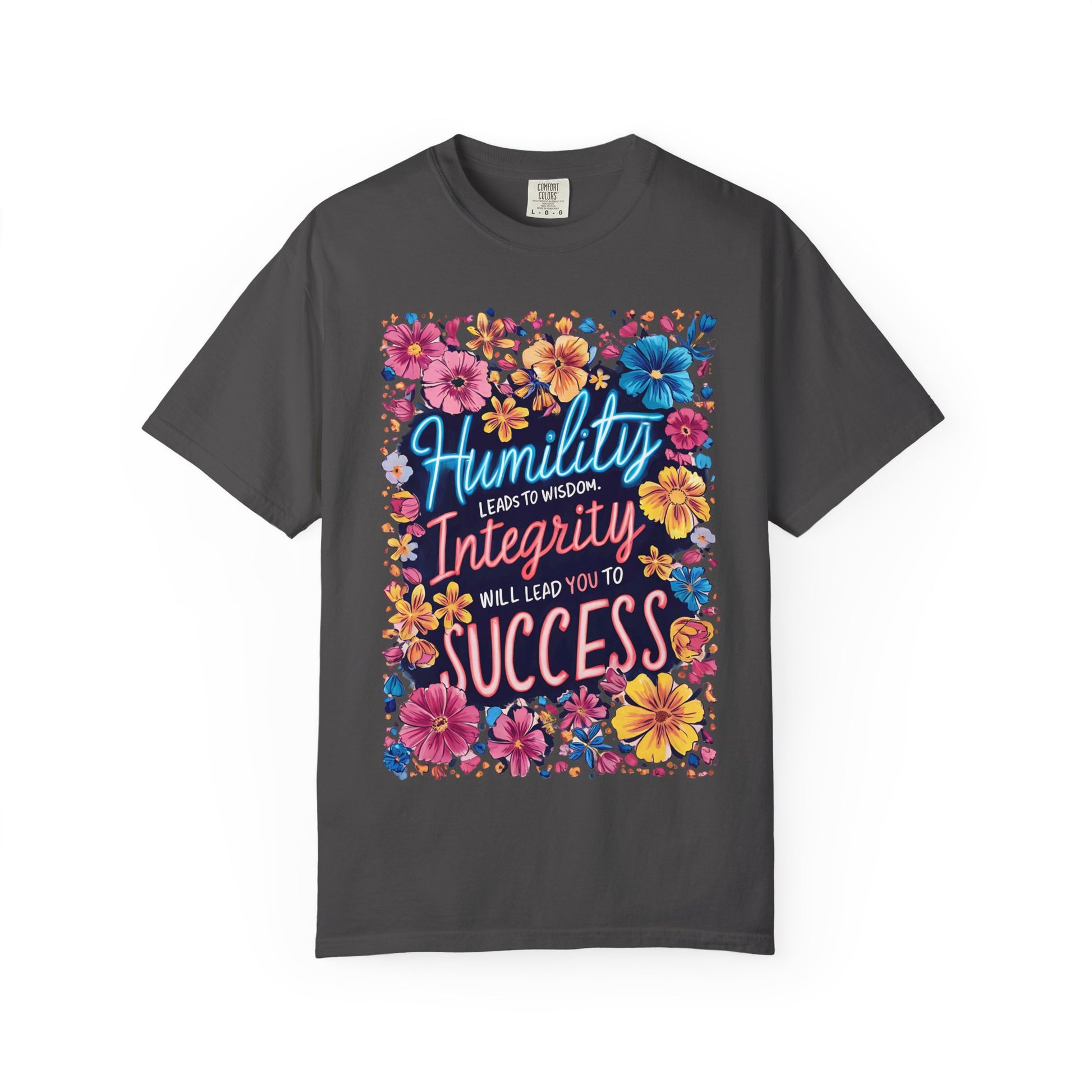 This graphic features a vibrant floral border in shades of pink, yellow, blue, and purple, framing a motivational quote: "Humility leads to wisdom. Integrity will lead you to success." The dark background enhances the contrast, making the text and flowers pop. The design blends visual elegance with inspirational messaging, emphasizing Christian values of humility and integrity as pathways to wisdom and achievement.