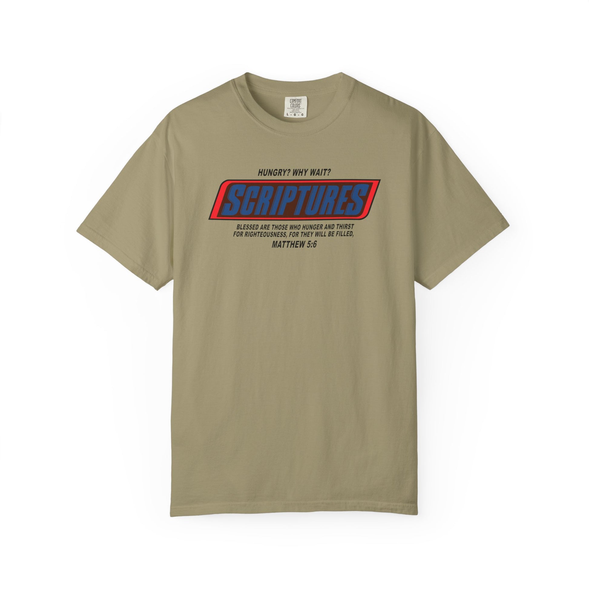 This graphic riffs on the iconic Snickers bar style with a bold Christian twist. The top line reads: Hungry? Why Wait? Below it, the word Scriptures is styled in bold blue and red font, mimicking candy branding. Beneath that, the verse Blessed Are Those Who Hunger And Thirst For Righteousness, For They Will Be Filled Matthew 5:6 delivers a powerful spiritual message. The design equates craving scripture with satisfying hunger, blending humor and faith.