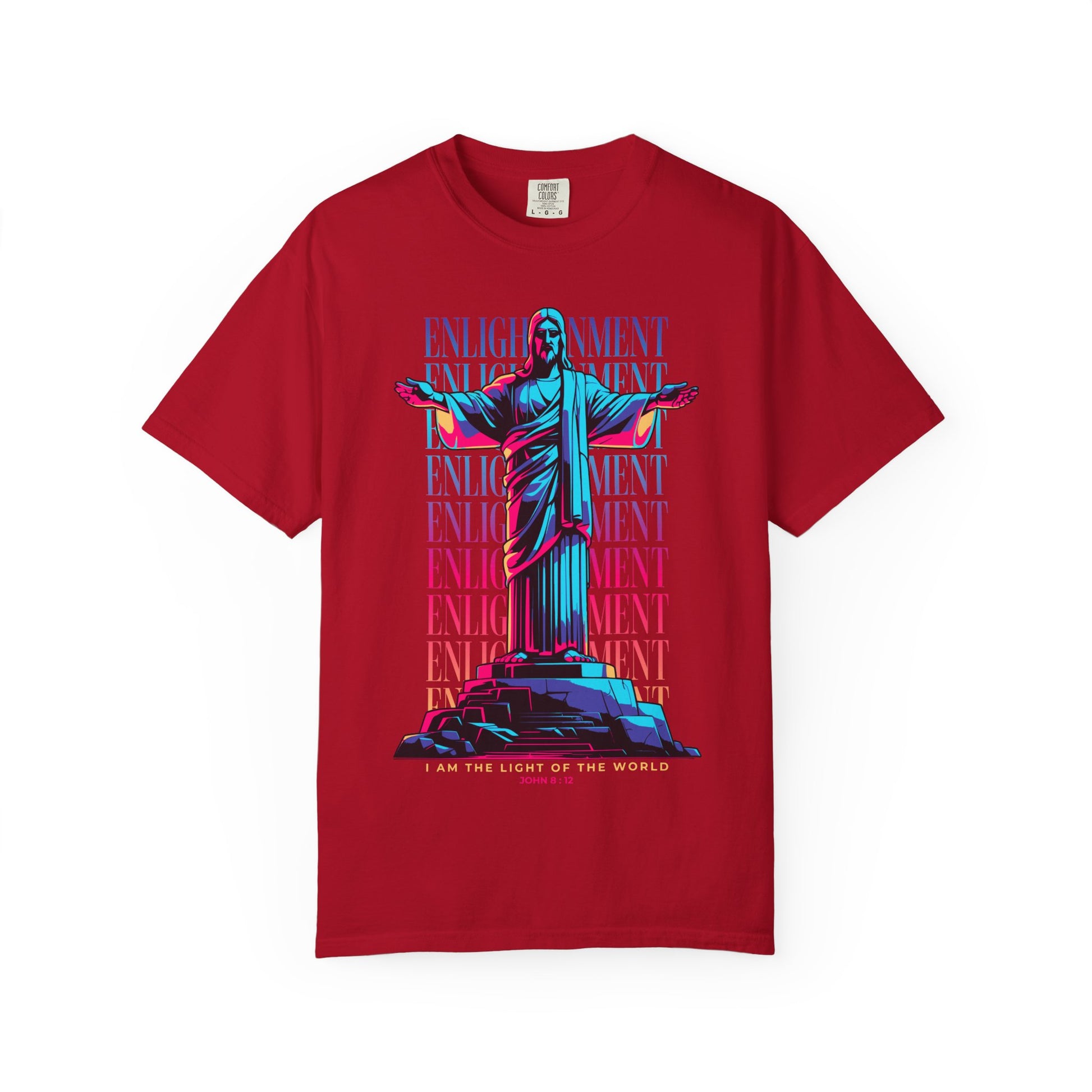 Christian t-shirt design featuring a vibrant illustration of Christ the Redeemer with outstretched arms, rendered in radiant blues and purples. The background repeats “ENLIGHTENMENT” vertically, while the phrase “I Am the Light of the World – John 8:12” anchors the message. A bold, artistic tribute to Jesus’ divine guidance and spiritual illumination, perfect for faith-forward apparel.