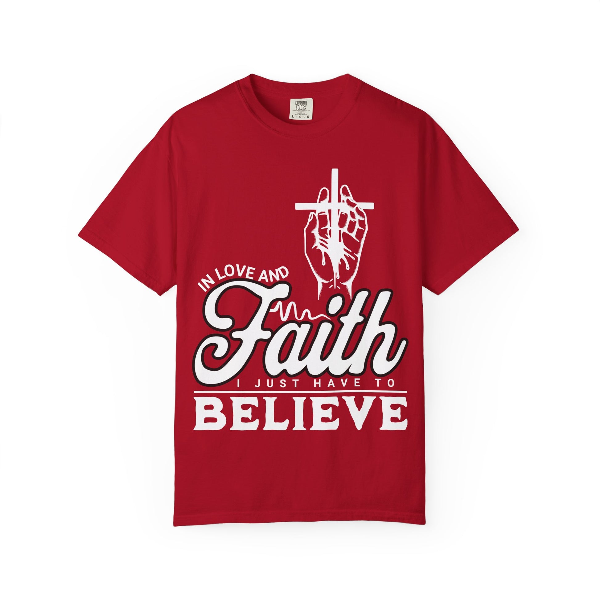Soft, lived-in cotton with a quiet message. This garment-dyed tee wears its faith openly — a simple script and a subtle hand holding a cross that reads: "In love and faith, you just have to believe." The relaxed fit drapes easily over jeans or layered under a jacket. Colors have that gentle, muted depth only achieved when a shirt is dyed after sewing, so each piece feels broken-in from day one. It’s the kind of tee you reach for when you want comfort and a gentle reminder to keep going — for Sunday mornings, volunteer days, or slow afternoons of reflection.