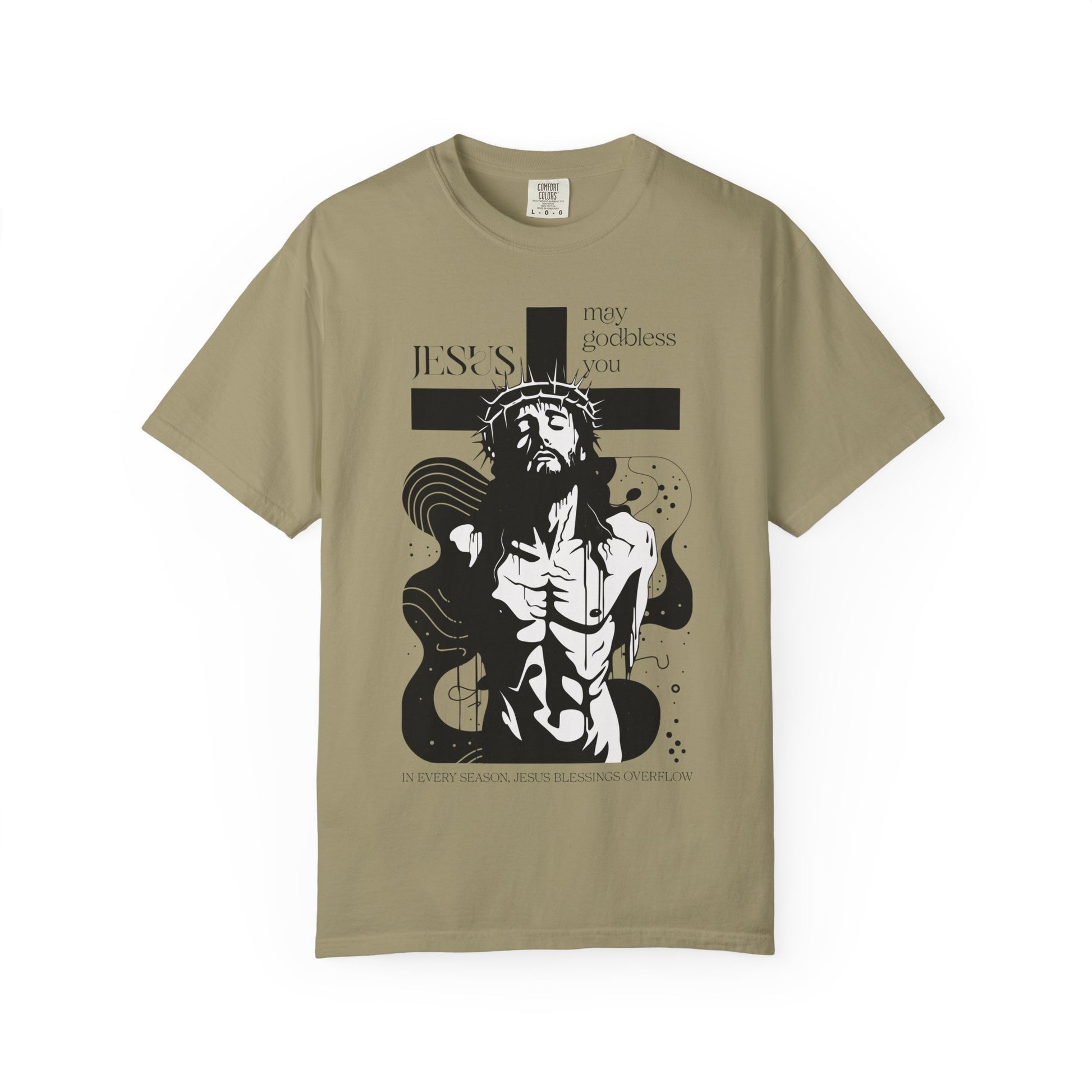 This shirt suits someone who seeks apparel that speaks beyond trend — people who favor meaningful imagery, faith-inspired iconography, or artful streetwear with a contemplative edge. Wear it to community gatherings, evening services, music nights, or quiet walks where the design becomes a conversation starter. The garment-dyed finish and wide color range let you choose a tone that matches your mood or ritual.