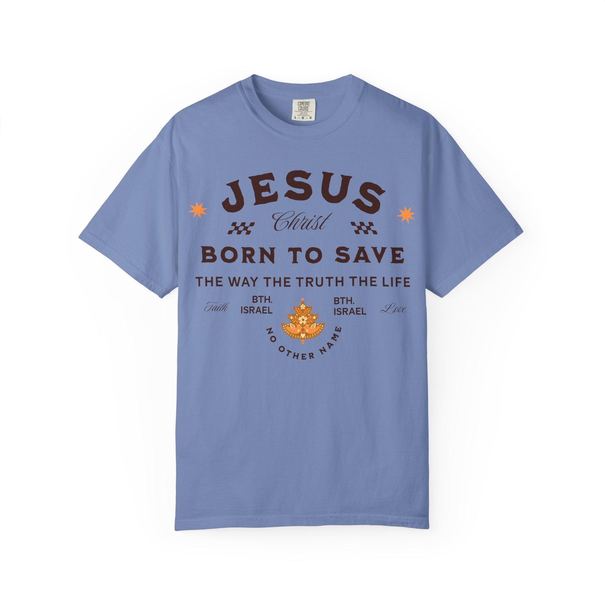 A layered and powerful Christian design featuring bold declarations of faith: "JESUS," "Born to Save," "The Way The Truth The Life," and "No Other Name." Stylized fonts and decorative stars frame the message, while "BTH. ISRAEL" repeats as a symbolic anchor. This tee is a visual creed for believers who want to wear their testimony and spark meaningful conversations about salvation and truth.