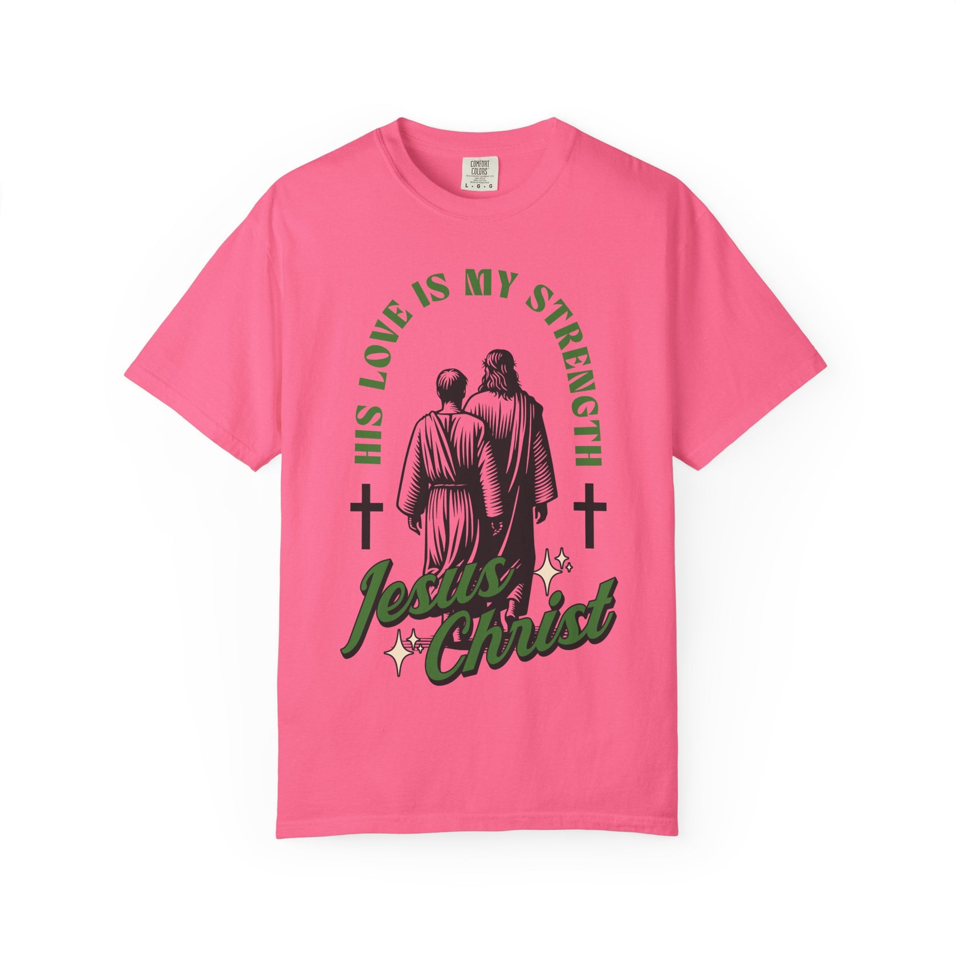 This Christian t-shirt graphic features two black silhouettes walking side by side, one representing Jesus Christ. Above them, arched green text reads "HIS LOVE IS MY STRENGTH." Flanked by two black crosses, the design centers on companionship and divine support. Below, "Jesus Christ" is written in large green and black cursive with decorative sparkles, emphasizing the strength and comfort found in His love and presence.