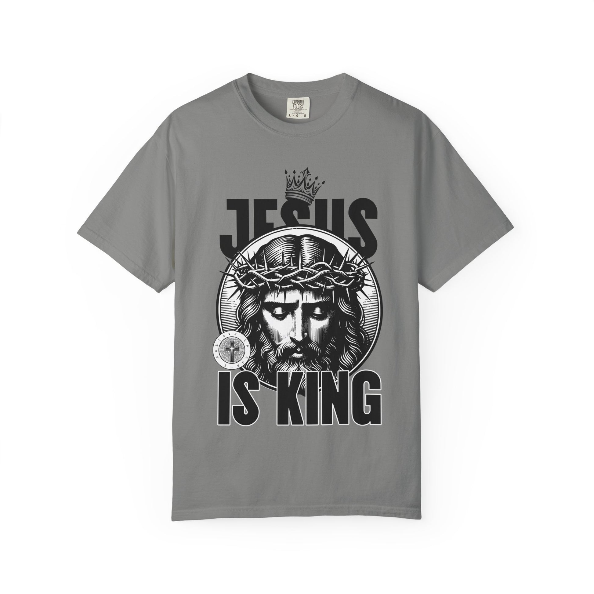 A relaxed, garment-dyed cotton tee that wears in soft and comfortable with each wash. The front features a bold, reverent graphic of Jesus crowned with thorns beneath a small crown emblem and strong “JESUS IS KING” lettering—an understated yet powerful way to carry faith into everyday life. The medium-weight 100% ring-spun cotton drapes relaxed over the body and the tubular, seam-free construction keeps lines clean. Double-needle stitching and a sewn-in label add durability for regular wear. Available in many colors and sizes, this shirt sits easily between casual weekend layers and church-ready simplicity—an honest, wearable statement for those who want their faith visible without shouting it.