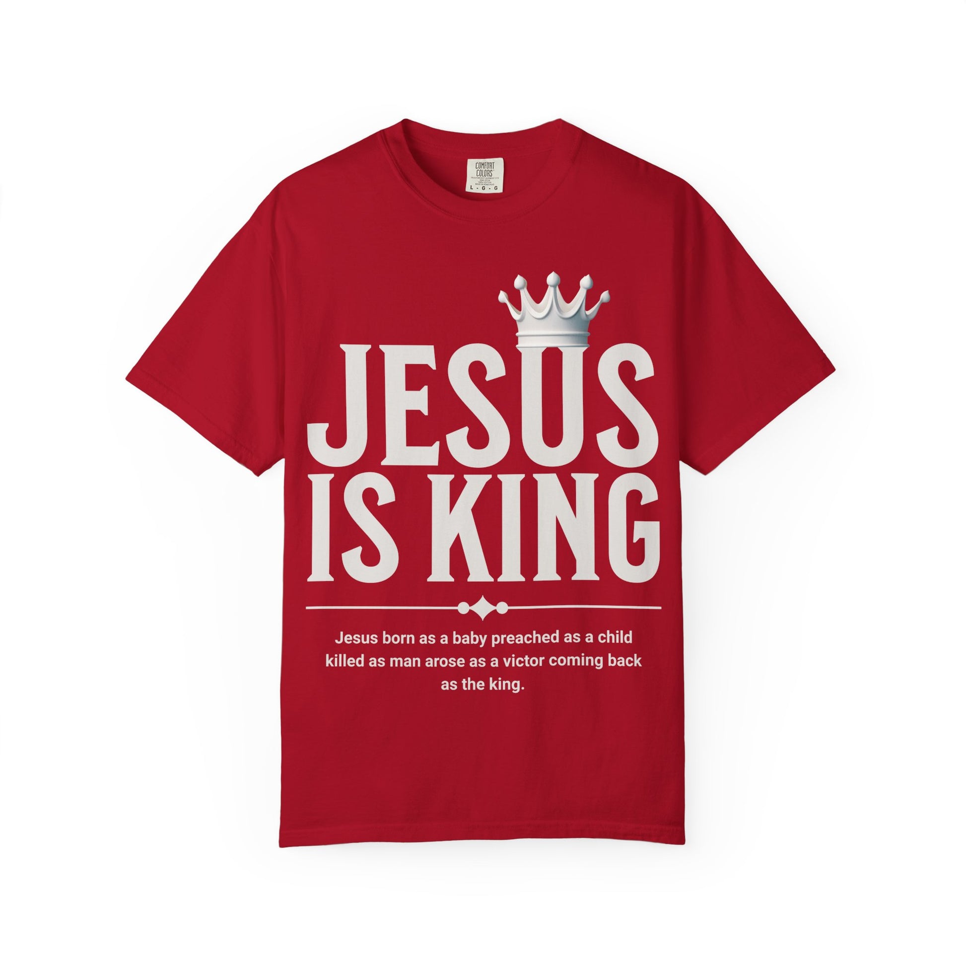 This garment-dyed tee carries quiet confidence. The bold "JESUS IS KING" typography with a subtle crown above the letters makes a clear, reverent statement without shouting. The soft, broken-in feel from post-construction dyeing and the relaxed fit invite repeated wear — Sundays, outreach events, or everyday life in the neighborhood. The medium-weight cotton drapes well under a jacket or on its own, and the understated back keeps attention on the front message. It’s a comfortable, durable wardrobe piece for people who want to share faith simply and thoughtfully.