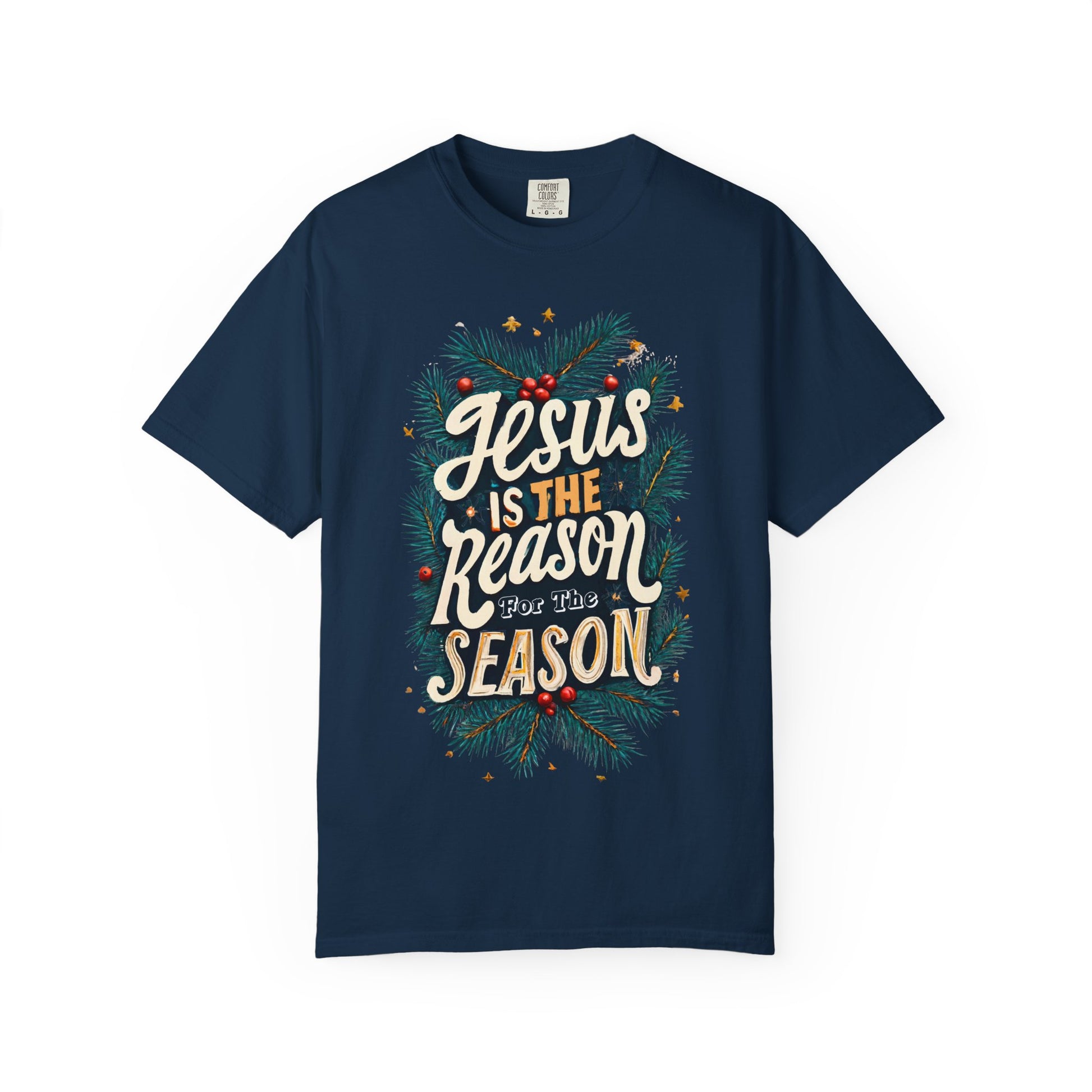 This design boldly declares the message “Jesus Is the Reason for the Season,” framed by festive pine branches, red berries, and golden stars. The decorative elements highlight the joy and reverence of Christmas while keeping the focus on Christ as the true center of the holiday. Perfect for worship services, family gatherings, or everyday wear, this shirt blends faith and festivity into a striking graphic that sparks conversation and celebrates the heart of the season.