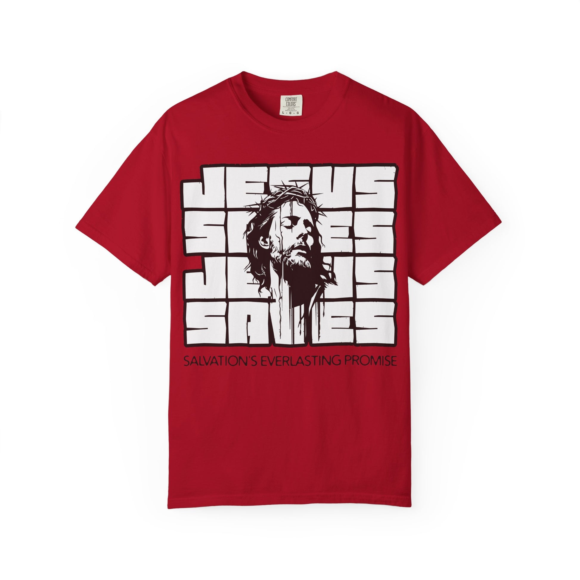 This garment-dyed tee wears its faith with gentle confidence. The front features a bold, block-letter graphic repeating “JESUS SAVES” with a contemplative portrait of Christ centered above the subtle line “Salvation’s Everlasting Promise.” The soft, lived-in color and relaxed fit make it feel like an old favorite from the first wear. It’s a quiet statement for Sunday gatherings, mission trips, worship nights, or everyday moments when you want your beliefs visible but not loud. The breathable, medium-weight cotton and pre-shrunk construction keep the silhouette steady through repeat wears and washes. Pair it with jeans, layered under a flannel, or worn solo — it sits naturally in the wardrobe of someone who wants comfortable, meaningful apparel that speaks to their faith and community.