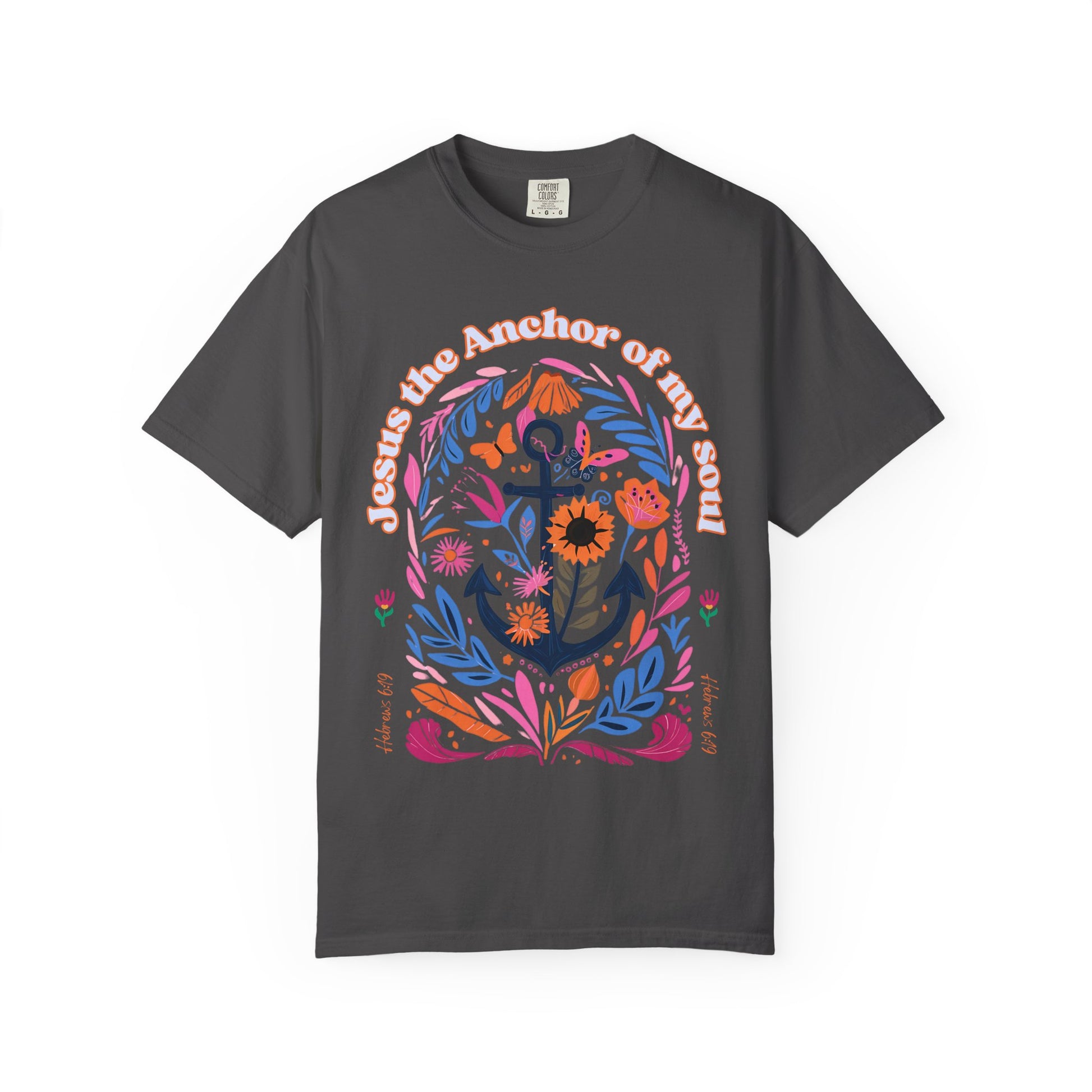 A navy blue anchor sits at the center of this vibrant design, surrounded by colorful flowers, leaves, and butterflies. The phrase “Jesus the Anchor of my soul” arcs above in bold white letters with orange outline, while “Hebrews 6:19” appears in cursive at both bottom corners. This graphic blends nautical symbolism with floral beauty to declare spiritual stability and divine grounding.
