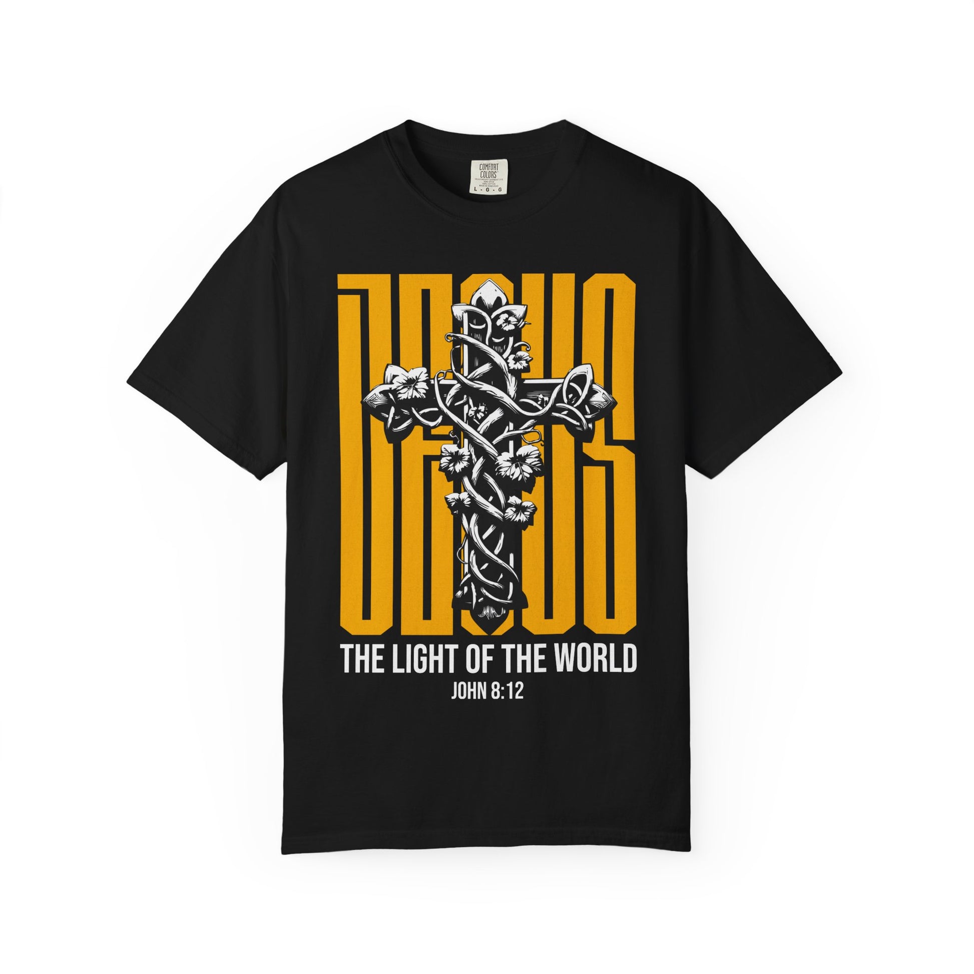 A bold cross wrapped in vines and flowers anchors this design, with “JESUS” in large yellow block letters behind it. Beneath the cross, the phrase “THE LIGHT OF THE WORLD” and “JOHN 8:12” declare Christ’s divine illumination. The intricate detailing and strong contrast deliver a visually compelling message of spiritual guidance and hope rooted in scripture.