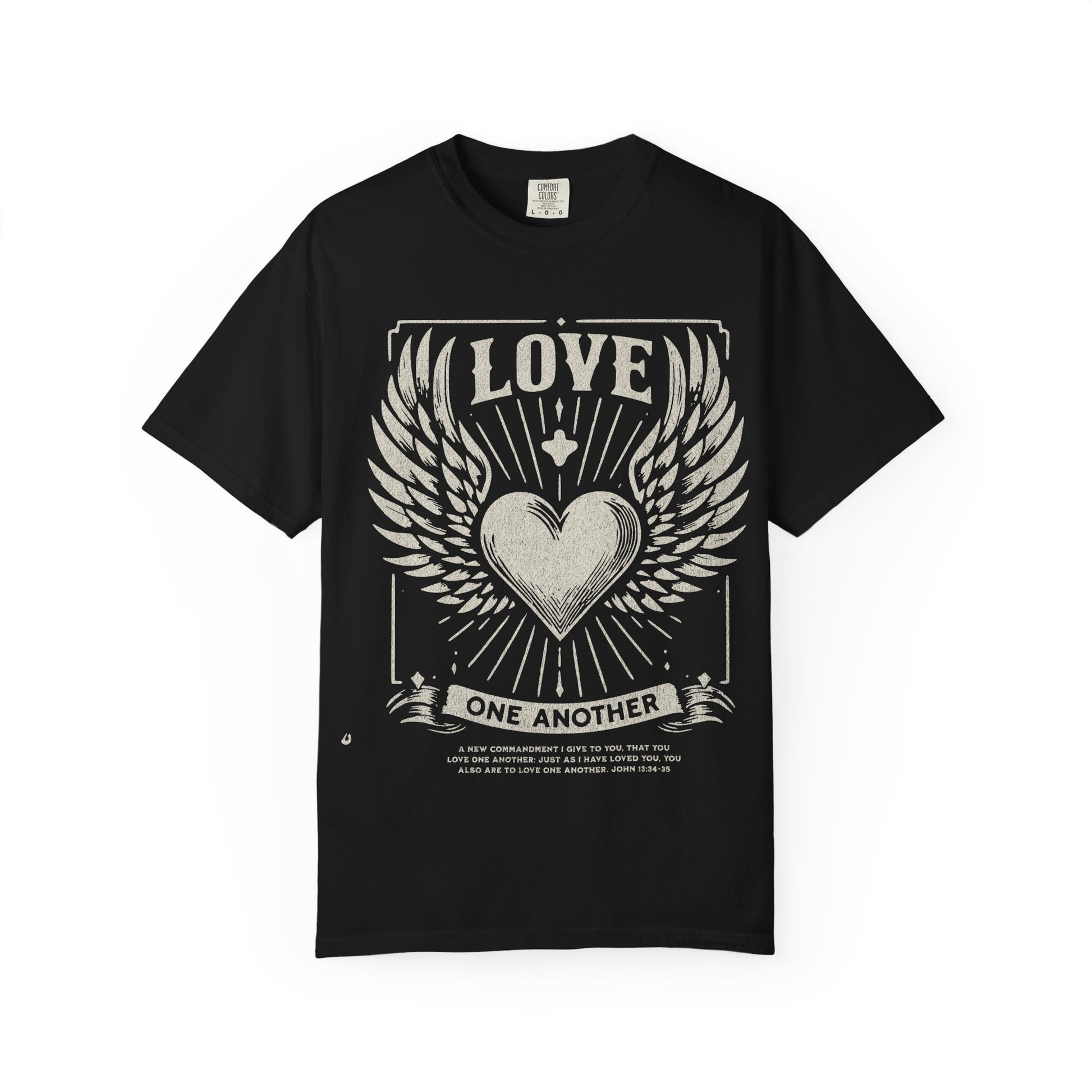 A winged heart radiates love beneath the bold word “LOVE,” with a banner declaring “ONE ANOTHER.” Below, John 13:34–35 reminds us to love as Christ loved. This design blends bold symbolism with scripture, offering a visual call to unity and compassion. It’s a heartfelt statement for believers who live out the commandment to love deeply and intentionally.
