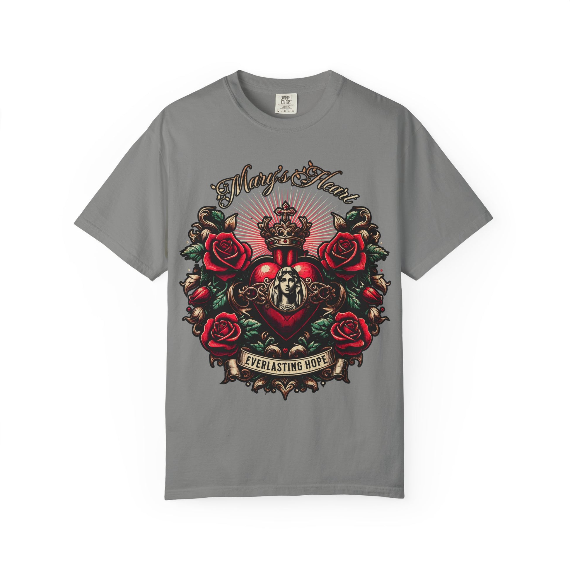 Christian t-shirt design titled “Mary’s Heart” features a crowned Sacred Heart encircling a monochrome image of the Virgin Mary. Surrounded by lush red roses and golden rays, the banner below reads “Everlasting Hope.” This ornate, faith-centered graphic evokes reverence and devotion, making it a powerful witness piece for believers honoring Mary’s role in salvation history.