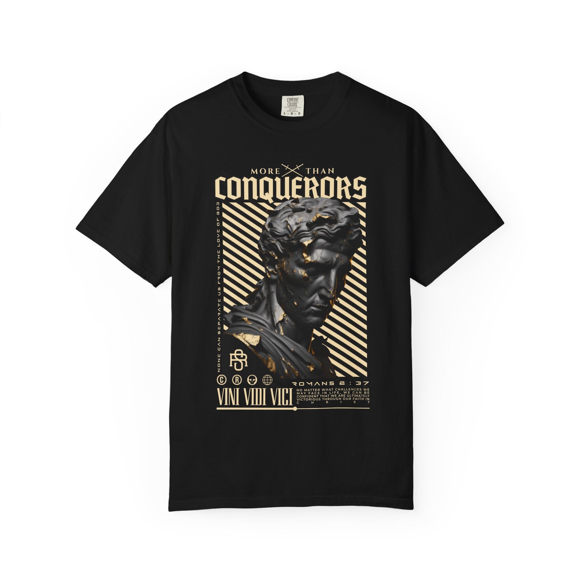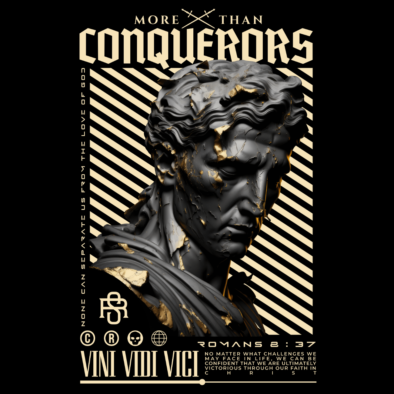 A surreal blend of classical art and scripture, this design features a fragmented statue bust with gold accents and bold text declaring “More Than Conquerors.” Romans 8:37 anchors the message, surrounded by affirmations of God’s unwavering love and victorious faith. Latin phrase “Vini Vidi Vici” adds a triumphant edge. The composition fuses ancient symbolism with modern grit, making it a powerful visual for believers who walk boldly in divine strength.