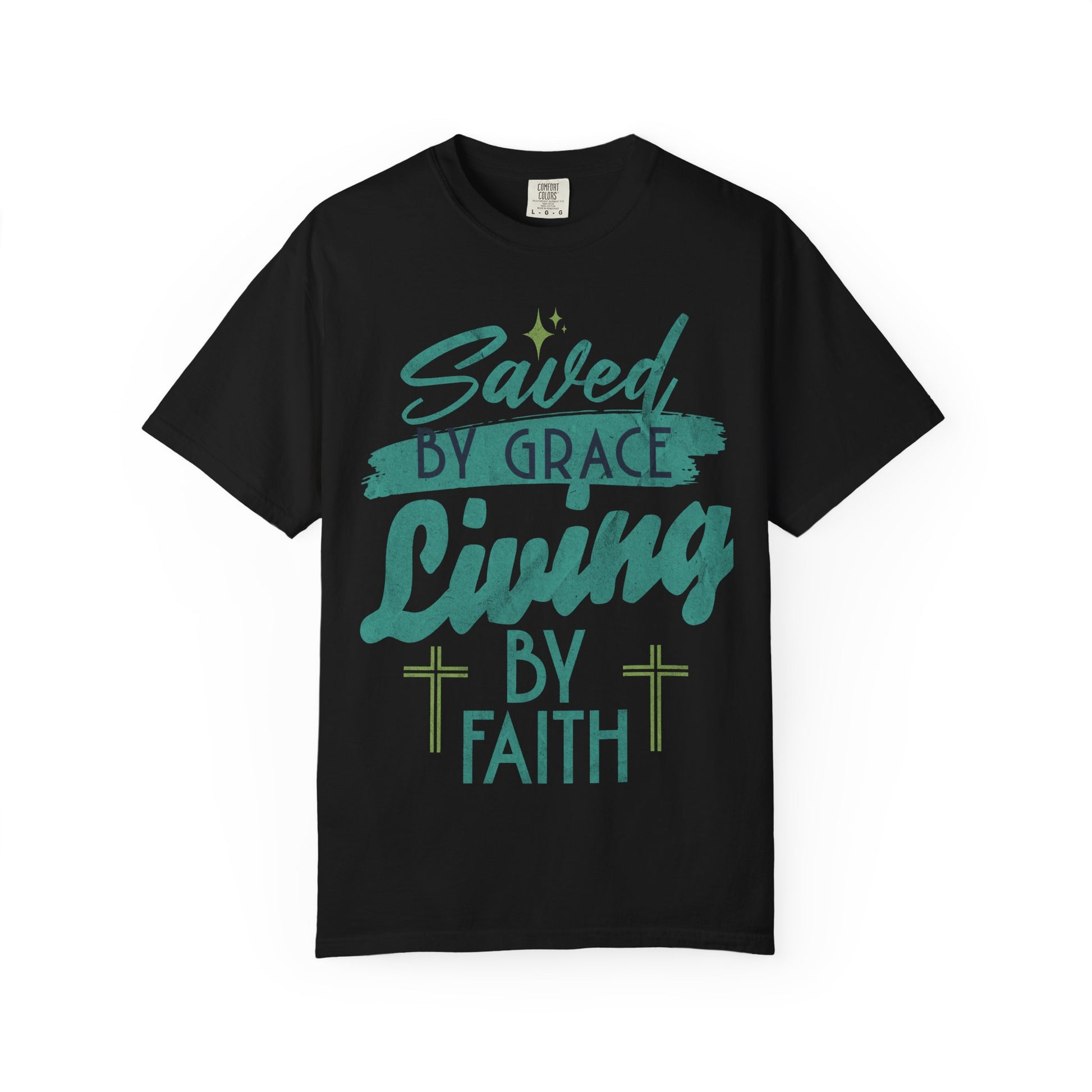 Teal and blue typography delivers the message “Saved by Grace, Living by Faith” with elegant cursive and bold block lettering. Crosses and sparkles accent the design, reinforcing its spiritual depth. This graphic blends style and conviction, offering a wearable declaration of salvation and daily trust in God’s promises. It’s ideal for believers who walk boldly in grace and faith.