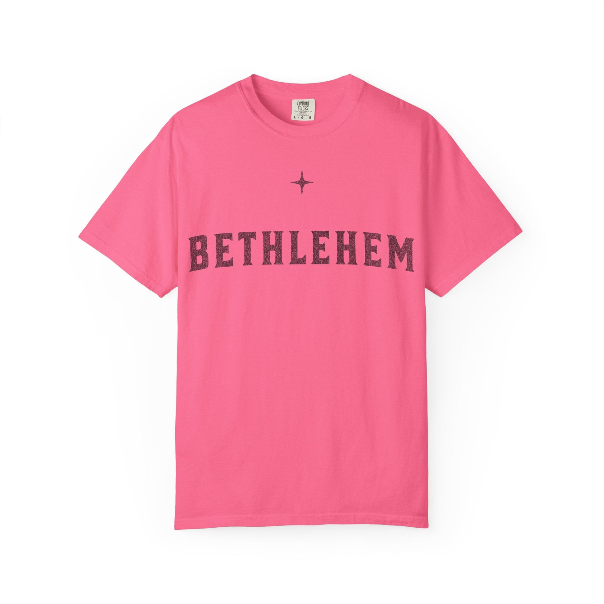 This minimalist design features the word “BETHLEHEM” in bold, textured lettering beneath a stylized star. It evokes the birthplace of Christ with quiet reverence and strength. The simplicity of the layout makes it a powerful statement of faith, perfect for those who want to honor the nativity story with subtlety and conviction during the Christmas season.