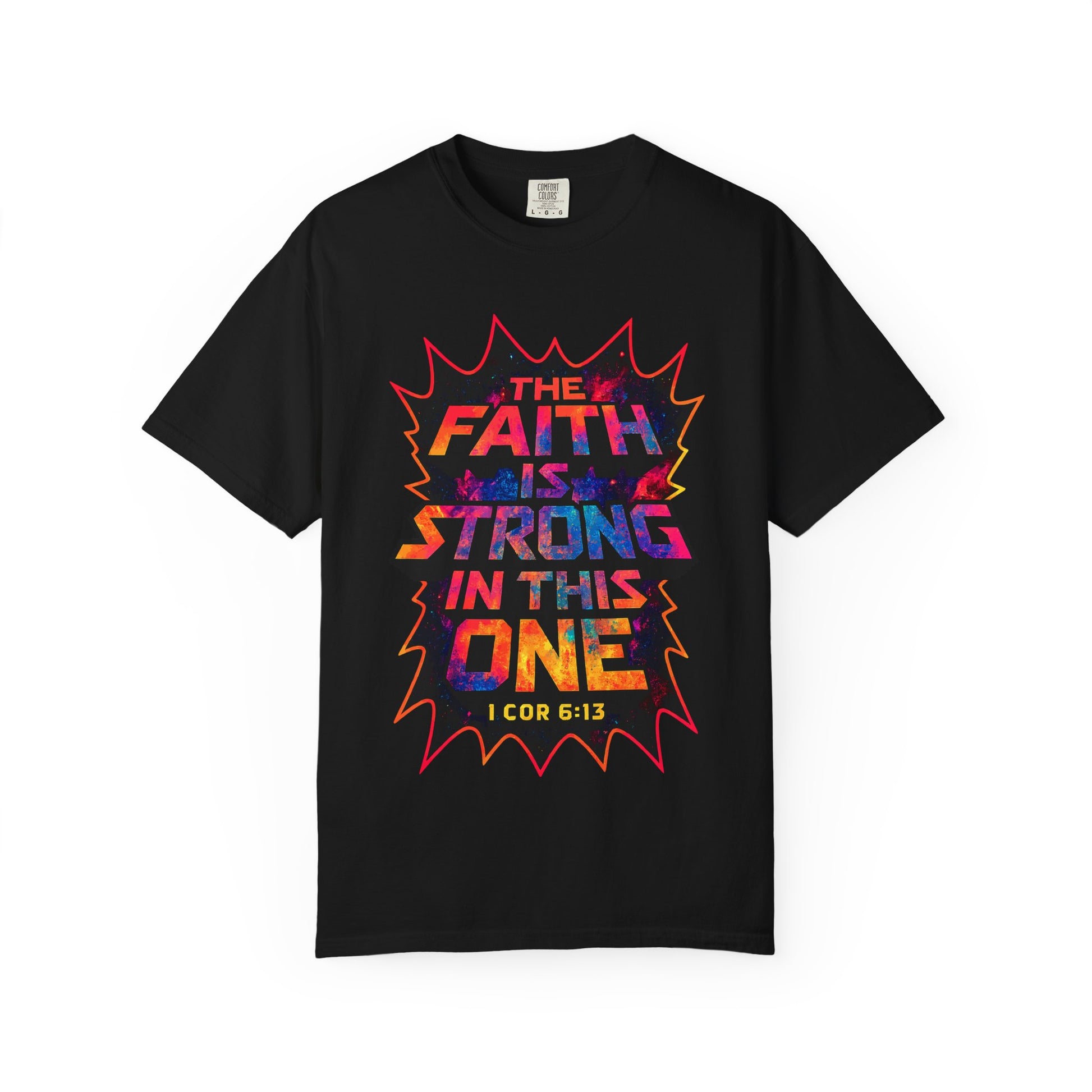 This Christian t-shirt design features a bold cosmic-inspired background with vibrant, multicolored lettering that reads “The Faith Is Strong in This One – 1 Cor 6:13.” Blending pop culture with scripture, it delivers a powerful message of spiritual strength and encouragement. Perfect for faith-based apparel, this unique graphic sparks conversation while showcasing biblical truth in a modern, eye-catching style.