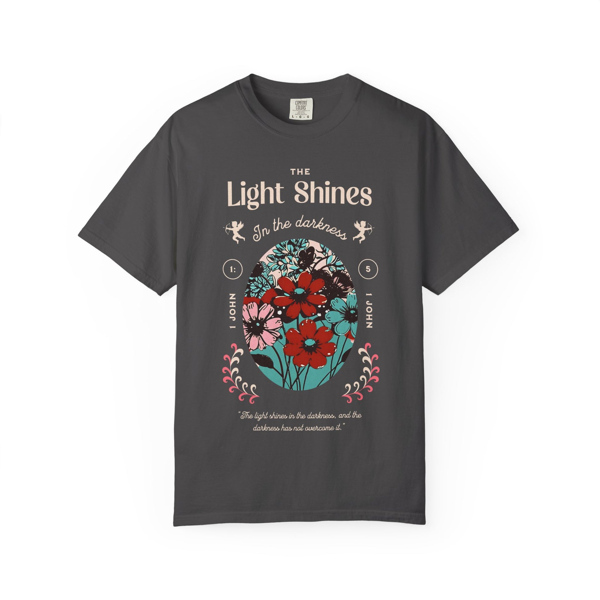 This design centers around the biblical phrase "The Light Shines In the Darkness" with two small angels flanking the text. A vibrant floral oval illustration anchors the composition, featuring red, blue, pink, and black flowers with green leaves. The scripture reference "1 John 1:5" appears on either side of the floral frame. At the bottom, a cursive quote reinforces the message of hope: "The light shines in the darkness, and the darkness has not overcome it."
