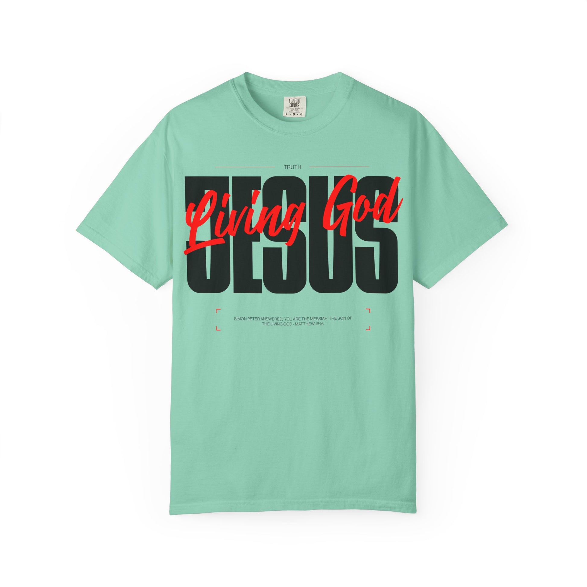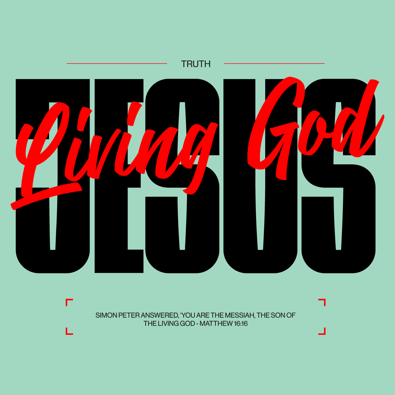 Bold typography anchors the design with the word "Jesus" in thick black block letters. Overlaid in bright red cursive is the phrase "Living God" and above it, the word "Truth" in smaller uppercase text. Below, a quote from Matthew 16:16 affirms Jesus as the Messiah. The composition blends strength and reverence, emphasizing divine identity and spiritual truth in a visually striking layout.