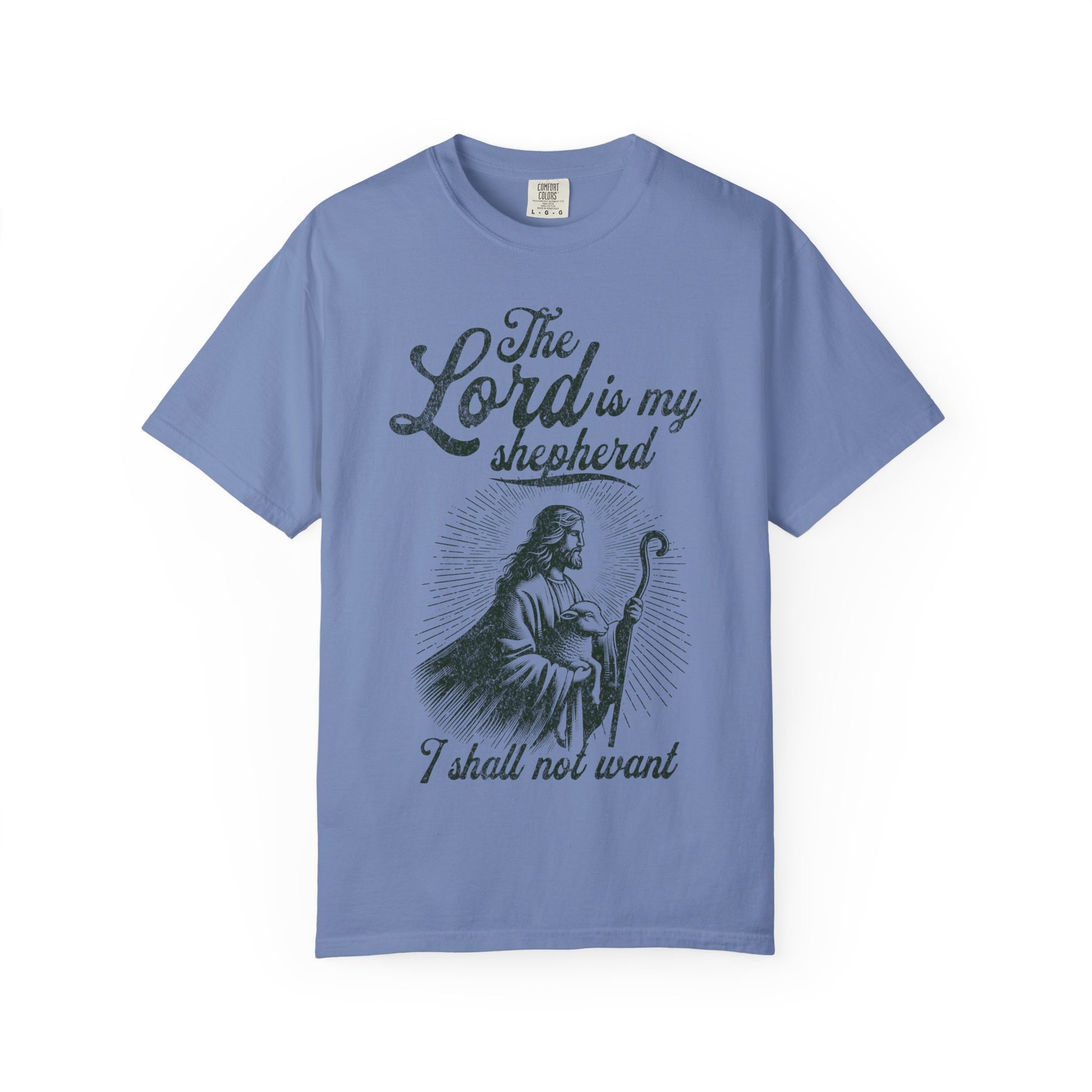 This graphic t-shirt design features a radiant depiction of Jesus holding a lamb and a shepherd’s staff, surrounded by divine rays. The text “The Lord is my shepherd, I shall not want” from Psalm 23 anchors the image, symbolizing comfort, guidance, and provision. The illustration evokes peace and trust in God’s care, making it a heartfelt expression of faith.