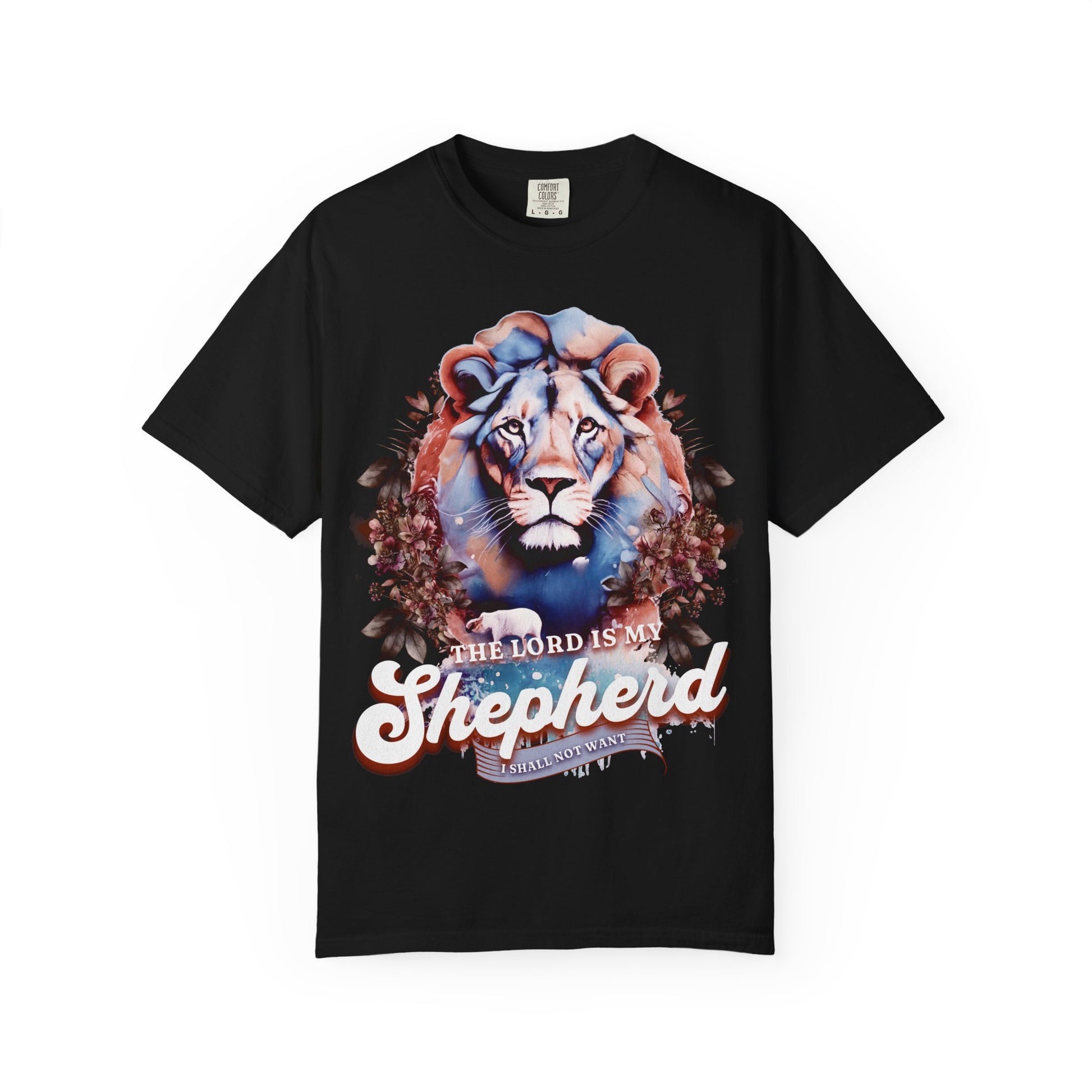 This relaxed-fit tee feels like a quiet, steady companion. The garment-dyed cotton wears in softly, and the lion portrait—framed by subtle foliage and the phrase “The Lord is my Shepherd”—brings a gentle, confident presence to everyday wear. It layers easily under a flannel or stands alone with jeans, carrying a calm, rooted energy for mornings at the coffee shop, Sunday gatherings, or late-night walks. The muted, lived-in dye tones let the art take center stage while keeping the shirt comfortably broken-in from the first wear.